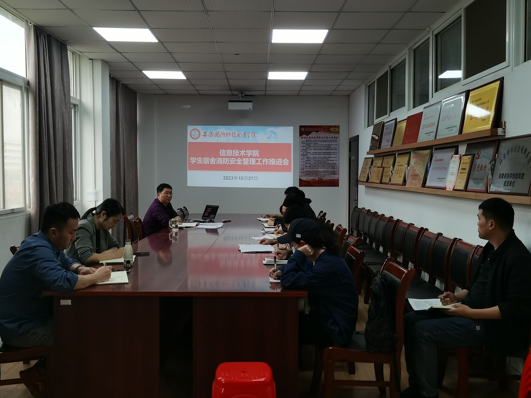 会上,杜洪宇结合学院工作实际,对学校两份通知文件进行了领学;通报了近一个月来,学院宿舍消防安全工作的开展情况,宣读了三份处分文件,开展了典型案例的学习、教育。各位辅导员从各自班级工作实际出发,对如何进一步深化宿舍消防专项工作提出了很多有针对性、可行性的意见和建议。