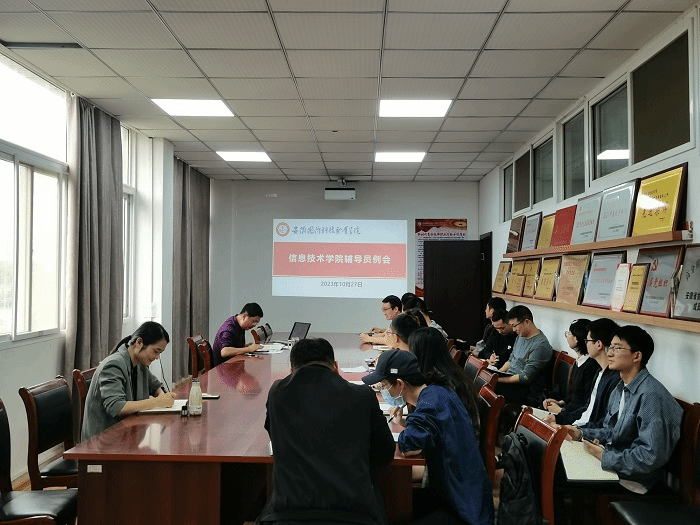 本网讯(信息技术学院 严晓曼) 10月27日下午,信息技术学院在知行楼304会议室召开全体辅导员工作例会。会议由学院党总支书记王胜主持,信息技术学院全体专兼职辅导员参加会议。