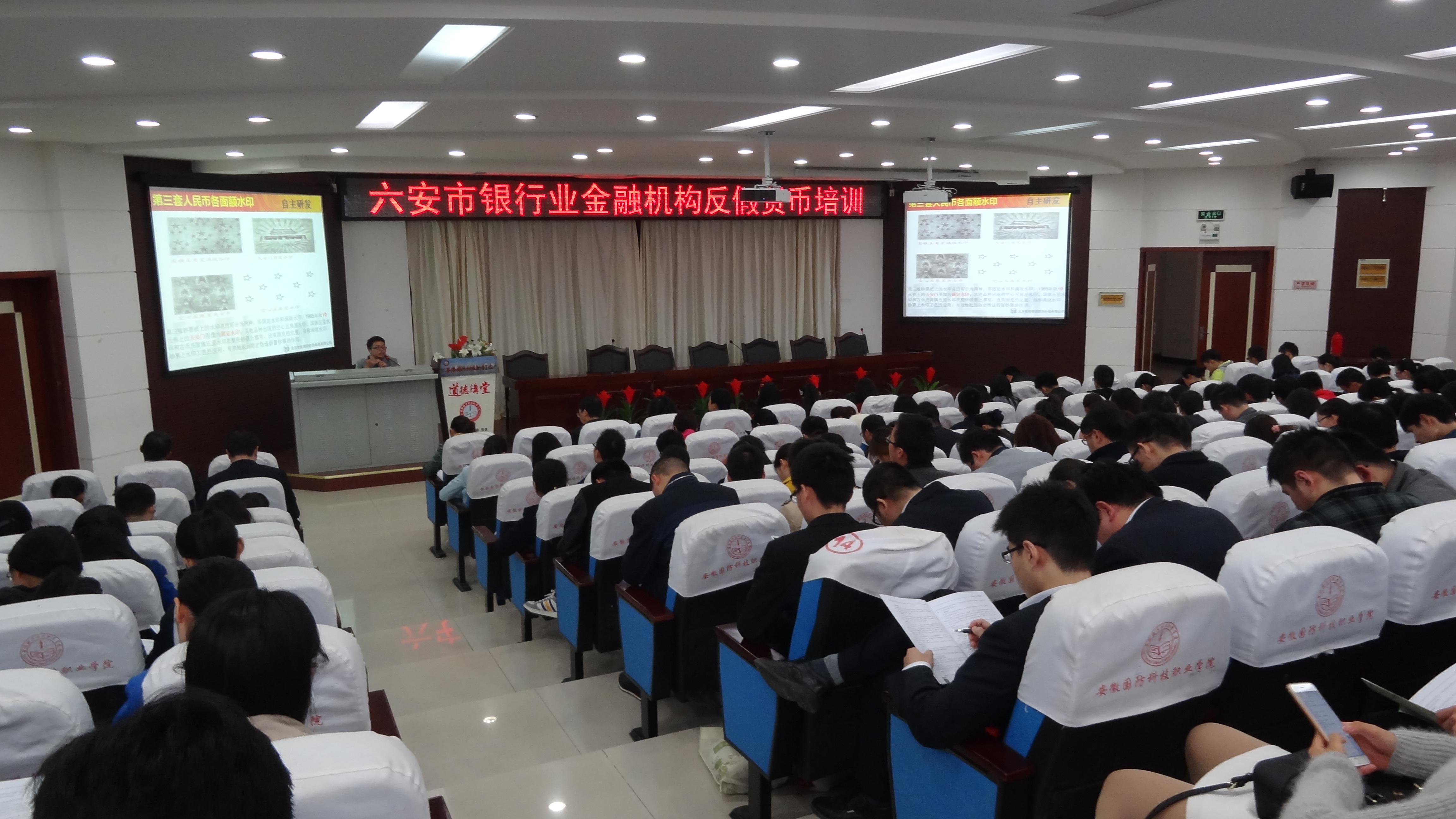 10月31和11月1日两天,六安市人民银行在我院图书馆报告厅举办反假币培训,邀请六安市人民银行货币科的专业人员担任主讲老师,来自六安地区各县近千人参加了培训。