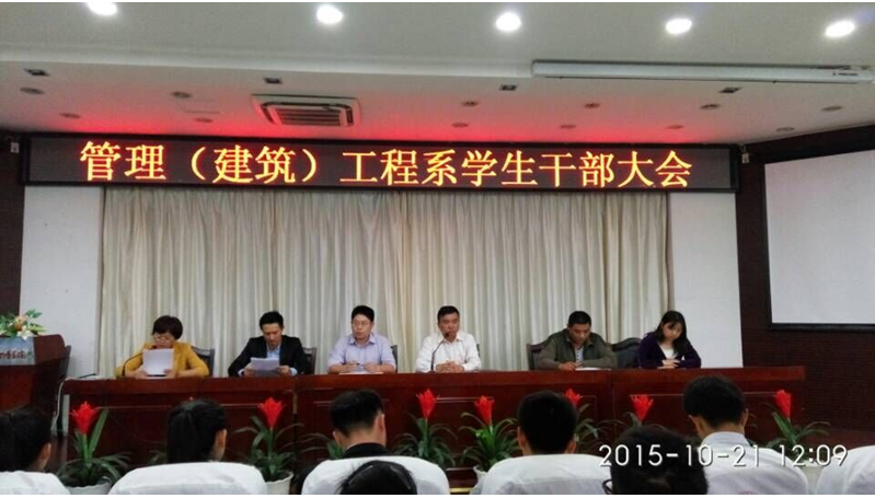 10月21日,管理(建筑)工程系在学院报告厅召开新学期首次学生干部大会。党总支书记杜先杨、党总支副书记杨力、团总支书记李文君、13级辅导员丁辉、14级辅导员付玉梅及15级辅导员雷雨出席本次会议,团总支、学生会全体成员及14、15级班干参加会议,会议由李文君主持。