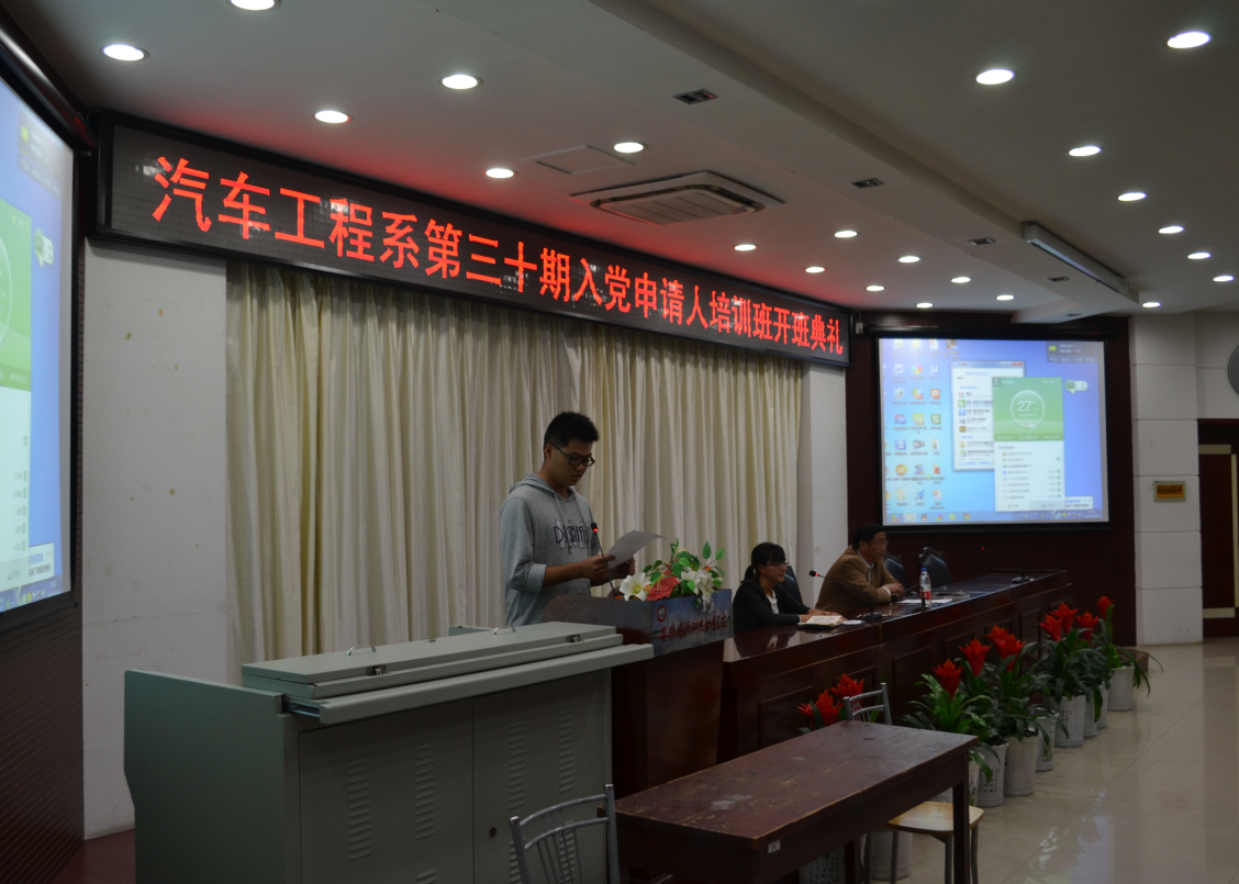 10月26日,汽车工程系在图书馆报告厅举行第三十期初级党课开班典礼。大会由辅导员戴柳老师主持,系党总支副书记叶启衡出席大会,全系242名培训班学员参加了此次典礼。