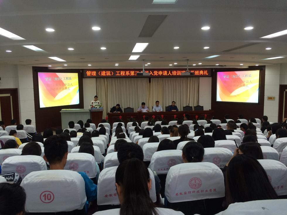 10月25日下午,管理(建筑)工程系在图书馆报告厅召开第30期入党申请人培训班开班典礼。系党总支书记杜先扬、系党总支副书记杨力、系工商管理支部书记杨学分、系13级辅导员丁辉出席会议。会议由13级辅导员丁辉主持,14级、15级部分学员代表参加大会。