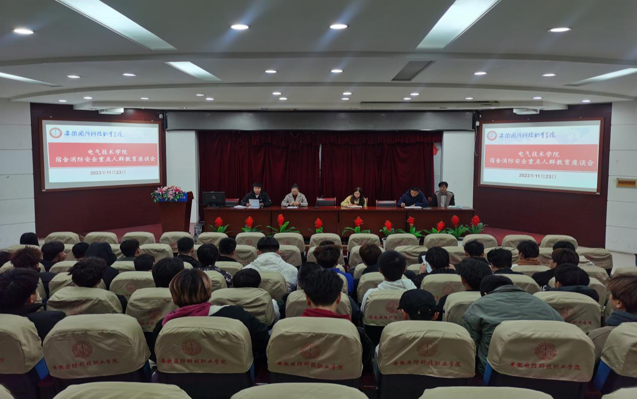 关注重点人群,消除安全隐患。11月23日,电气技术学院在图书馆二楼报告厅召开了宿舍消防安全重点人群教育座谈会。会上,吴泽建老师宣读了学生宿舍消防安全巡查情况的通报、近期违反宿舍消防安全二十条的处分文件,同时现场组织签订了《宿舍消防安全重点人员个人承诺书》;张丽通过近年来全国发生的重特大火灾事故及惨痛教训的相关案例,要求同学们要以“一失万无”的底线思维,扎实开展消防安全工作,全力守护宿舍消防安全。