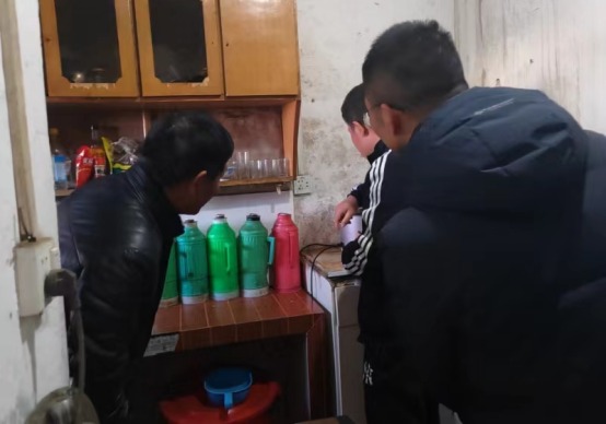 驻村第一书记韩纪平、村书记兼主任宋杰对徐俊一行的到来表示热烈欢迎,在村办公室对村里目前的各项情况尤其是村供电设施和居民用电线路做了简要介绍,接着在村委领导的带领下,随机进入几户农户家实地进行用电安全排查,入户宣传用电安全常识,详细记录每一户存在问题情况,例如在居民翁昌福家,发现线路老化,厨房线路经由吊顶铝塑板内铺设;周庆胜家的五金加工作坊使用的开关依然是老式的刀式匝刀,厨房插座质量较差已存在插口处烧灼痕迹;村个体户理发室存在线路走线随意搭接,线路超负载运行,热水器未接地等,此次活动共排查公共区域2处,农户5户,排查问题15个。