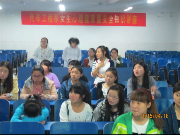 4月16日晚上7:30,汽车工程系在2教105教室举办了女生心理健康暨安全知识讲座。该讲座由汽车系14级辅导员戴柳老师主持,院心理咨询中心国家二级心理咨询师周晓梅老师担任主讲。该系40余名女生聆听了此次讲座。