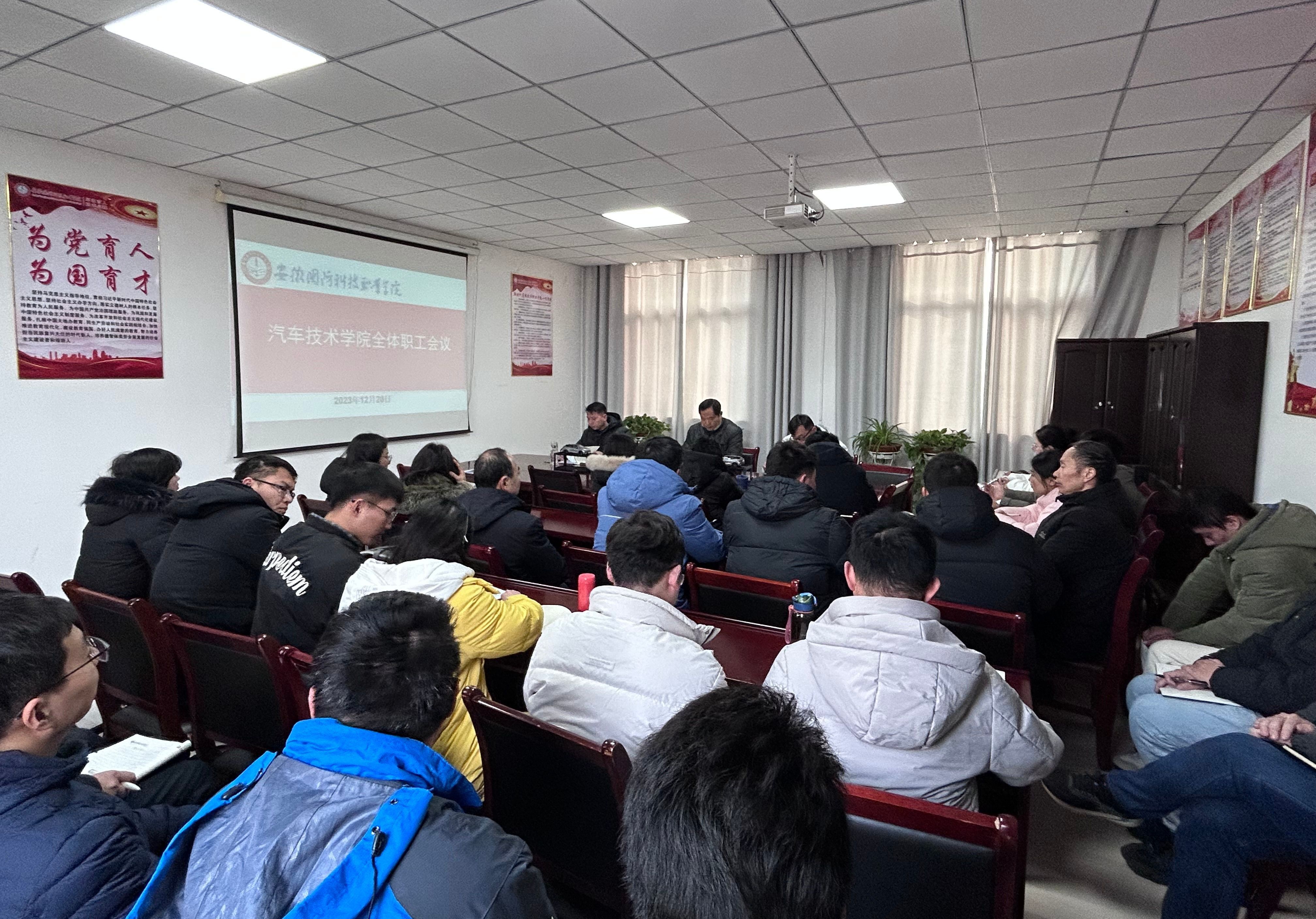 本网讯(汽车技术学院 任培培)为深入贯彻落实习近平总书记关于教育的重要论述,确保2023年工作顺利收官,推动2024年工作走向良好开端,12月20日下午,汽车技术学院召开全体职工会议,及时总结2023年工作完成情况和成果经验,提前谋划期末和新年重点工作。学院党总支书记、院长孙良平主持会议。
