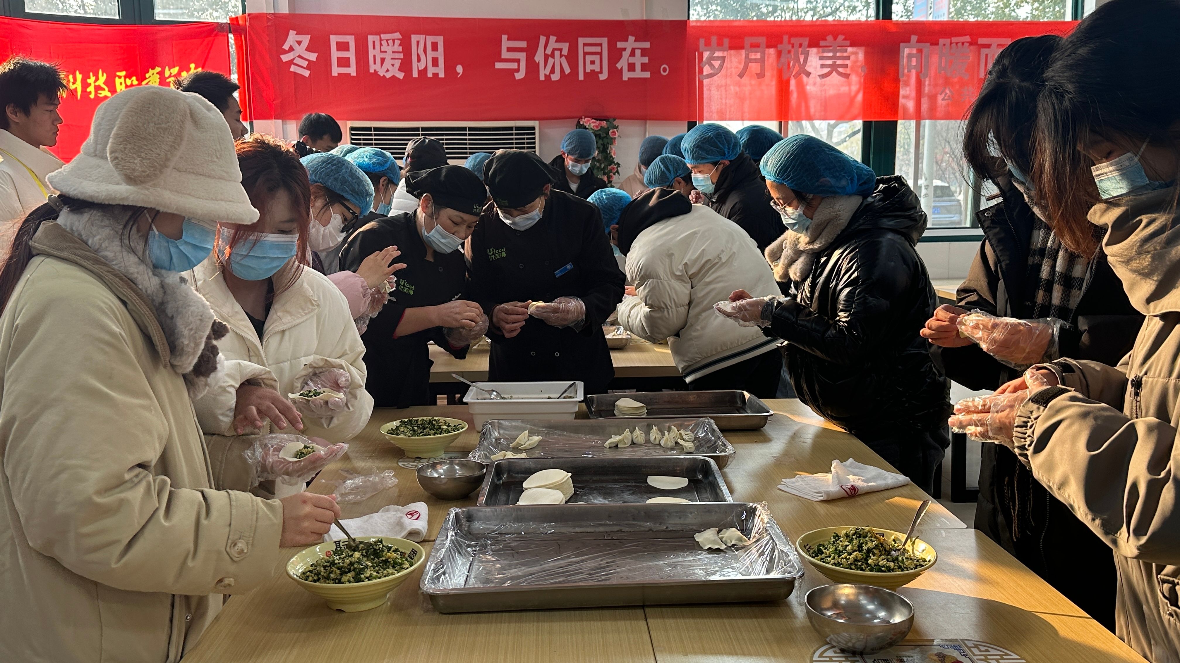 此次活动得到了学校一楼食堂的大力支持,为活动提供了场地,食堂工作人员在活动开始之前将所有工具和食材准备到位。活动中,食堂阿姨们也参与其中,指导学生们包饺子、煮汤圆、炸南瓜饼。活动现场,井然有序、忙而不乱,“你看我包的饺子像不像元宝”、“你这包的不紧,再捏一捏才行”“你看我包的最好看,待会我一定要吃它”……同学们一边包饺子一边说着笑着,都沉浸在轻松愉快的氛围中,一起感受着冬日的温暖。来自22级信息技术学院的王晔同学说:“真的感觉好像回家了一样,很温暖很开心,这下不想家啦!”