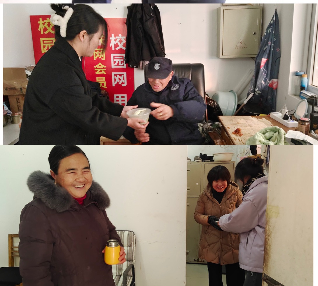 在一片欢声笑语中,热腾腾的水饺、汤圆和南瓜饼出锅了,同学们一同品尝着这份暖意。汤老师提议同学们要把这份温暖传递出去,大家找来了餐盒,把一份份热腾腾的“温暖”送到了学校保安叔叔和宿舍管理阿姨的手里,让他们在寒冷的冬日感受到来自同学们的温情。“阿姨,这可是我们自己亲手包的饺子,皮薄馅大哦”,接过同学们的汤圆和水饺,工作人员也很开心和感动。