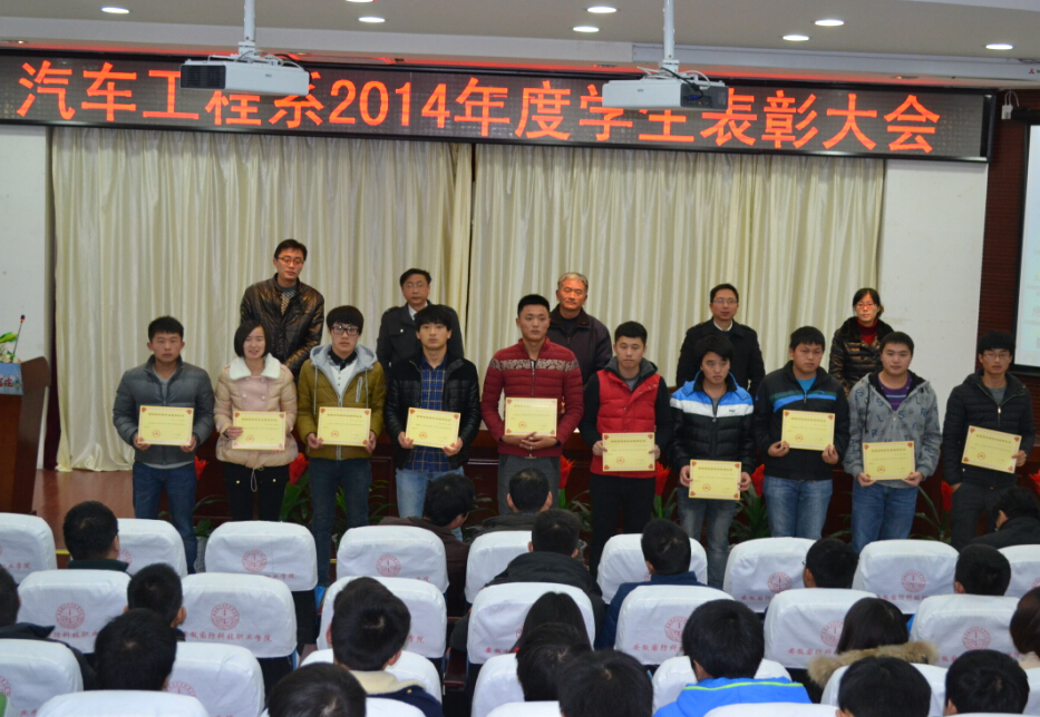 大会由汽车系党总支副书记叶启衡致辞;汽车系团总支书记余桂刚分别宣读了我系2014学年度国家励志奖学金获得者名单以及获得2013-2014年度院级先进班级、三好学生、优秀学生干部以及在本系学生会各部门所举办活动中荣获前三名的人员名单;出席会议的各位领导为获奖的集体及个人颁发了荣誉证书。接着,汽车系2014年度国家励志奖学金获得者13汽服1班的沈玲玲同学代表所有获奖同学进行发言。