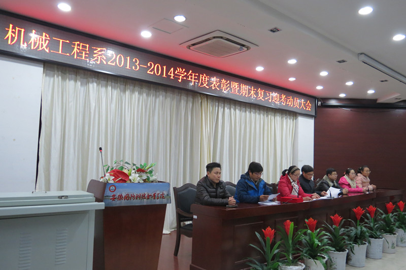12月25日晚,机械工程系2013-2014年度表彰暨期末复习迎考动员大会在图书馆报告厅成功举行。机械系党总支书记吴方庭、系副主任李存鹏、副书记陈思、团总支书记孙策、各年级辅导员出席了会议,学生会全体成员、获奖学生代表参加了会议。