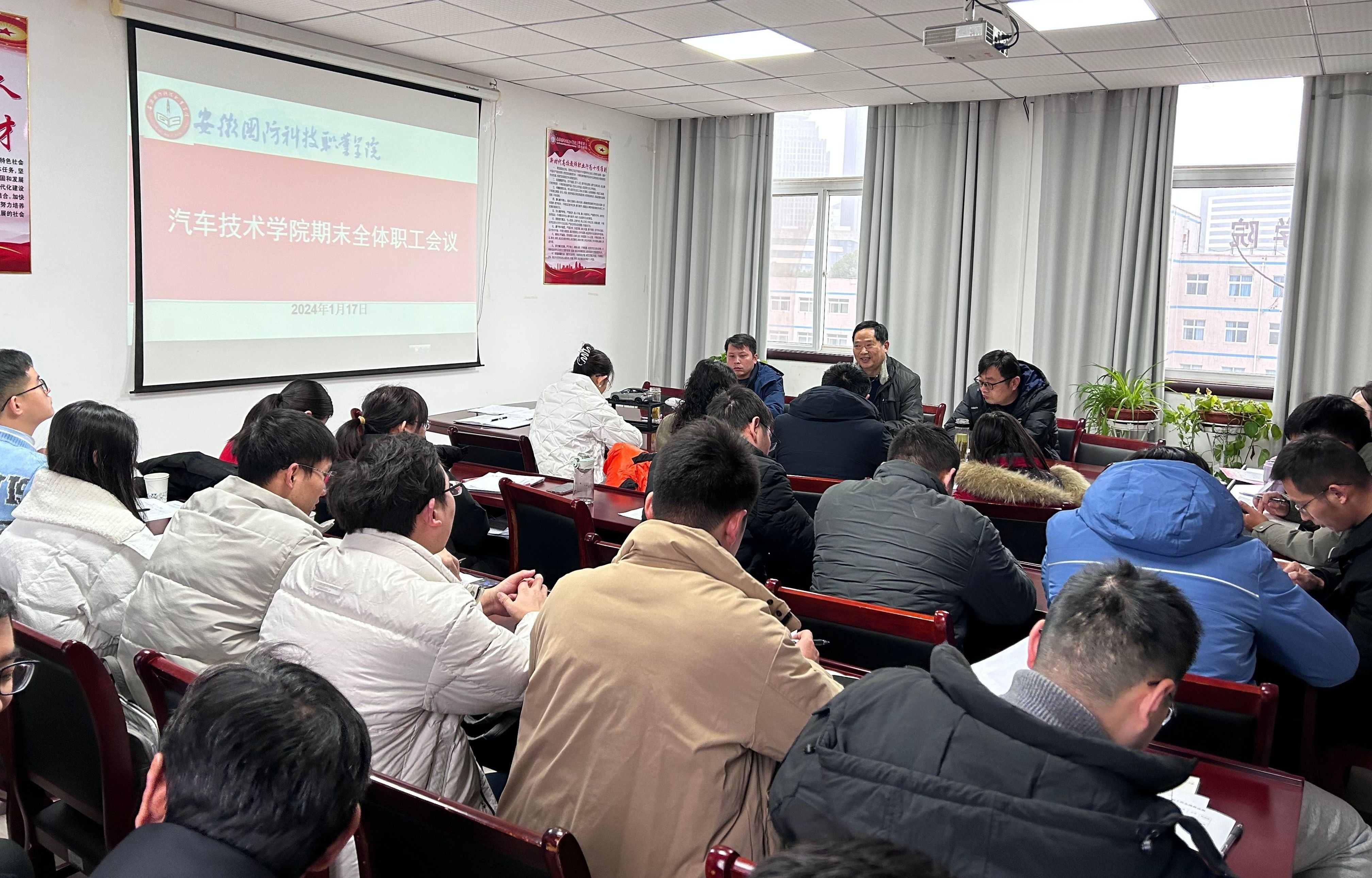 本网讯(汽车技术学院 任培培)1月17日上午,汽车技术学院召开期末全体职工会议,总结2023年度学院工作,传达上级有关文件精神,部署安排假前重点工作。学院党总支副书记余桂刚主持会议。