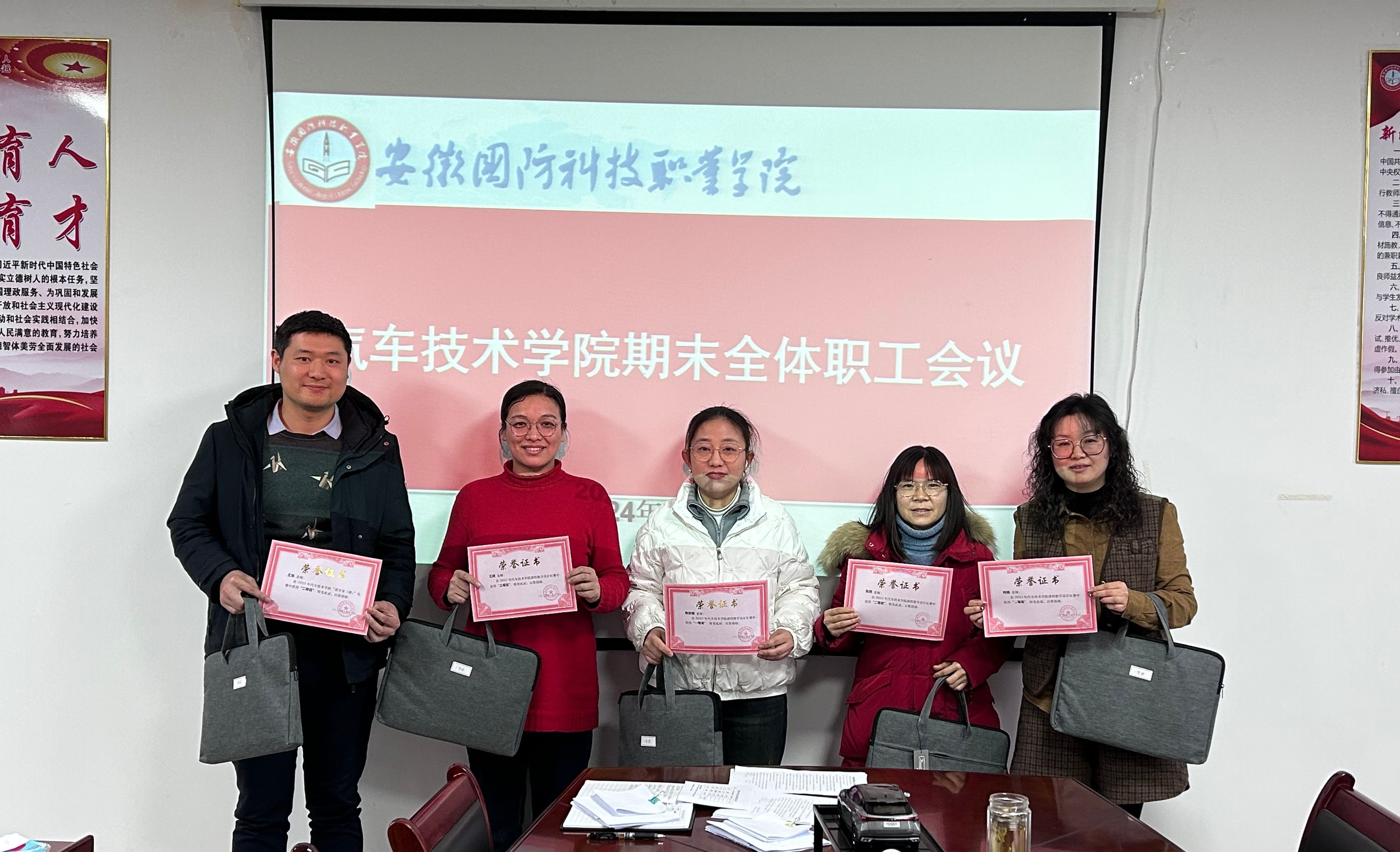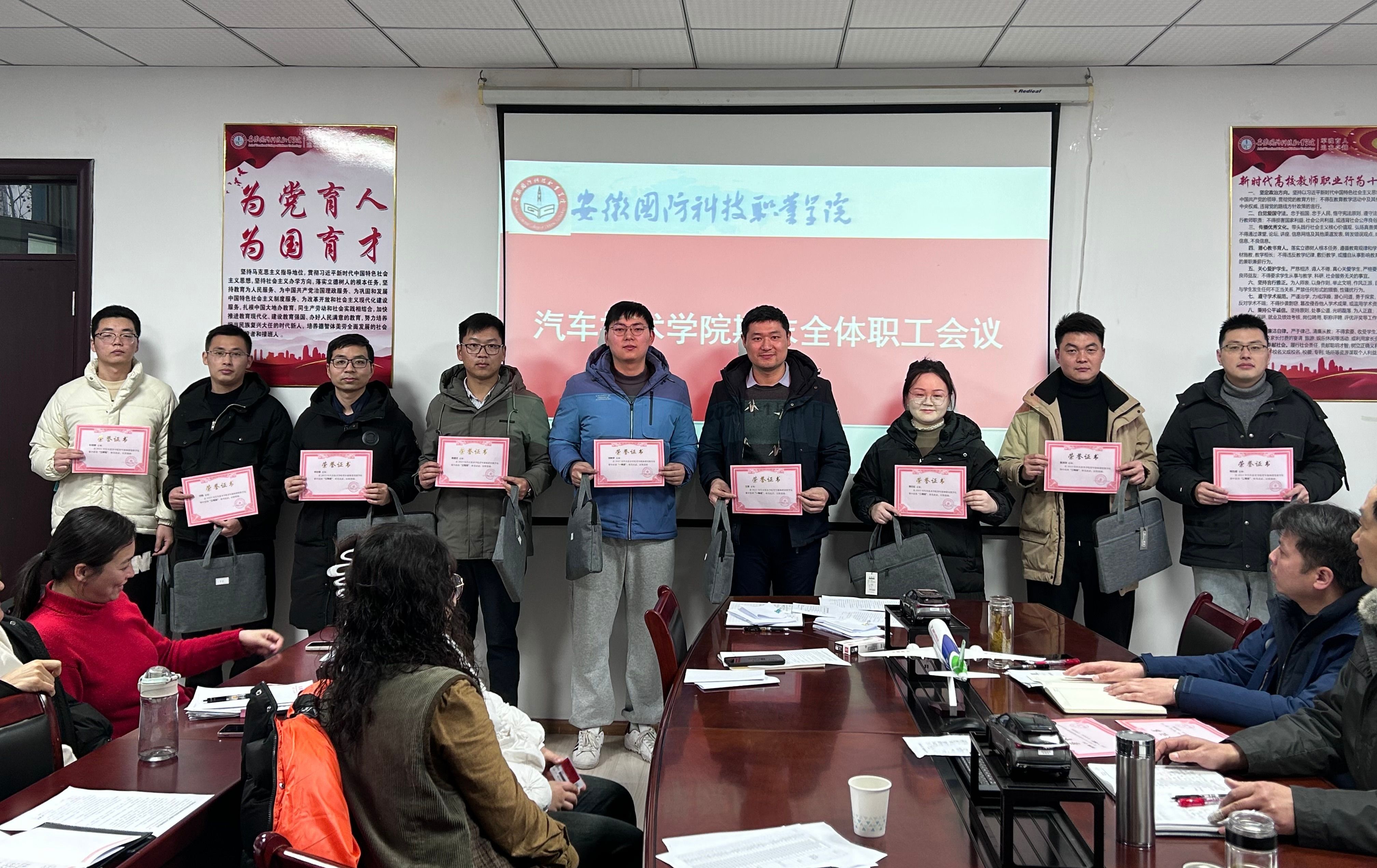 会议向在2023年学院说专业(群)、课堂教学设计、青年教师课堂竞赛中获奖的老师颁发了荣誉证书。全体职工集体观看了安全教育专题纪录片《生命重于泰山》,并签订了安全责任书。
