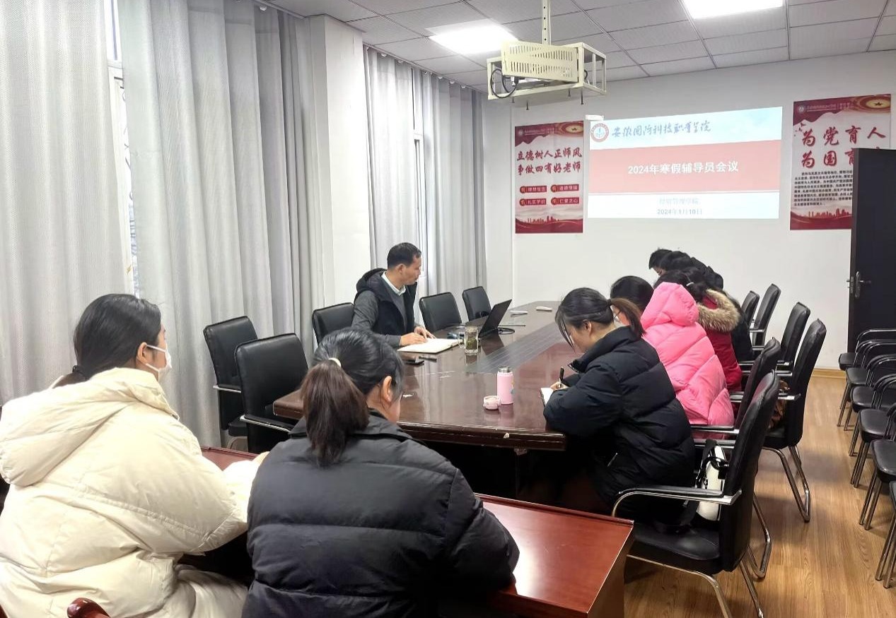 高度重视,细化工作部署。学院党总支书记刘峰主持召开2024年寒假辅导员专题会议,传达学习学校《关于2024年寒假前后有关学生工作安排的通知》文件,对学生离校交通安全、宿舍消防安全、冬季传染病防控、假期安全教育、宿舍安全检查、网上评教等重点工作进行细化部署。刘峰要求,全体辅导员要强化校园安全稳定,紧抓期末关键节点,通过深入教室、走访宿舍、谈心谈话、主题班会等方式,多方位了解学生思想动态,积极解决实际困难;要落细落实学生离校返家工作,逐一摸排学生返家离校信息,做到心中有数,确保学生安全到家;要克服麻痹大意的思想,高度重视在校学生管理,安全教育不放松。