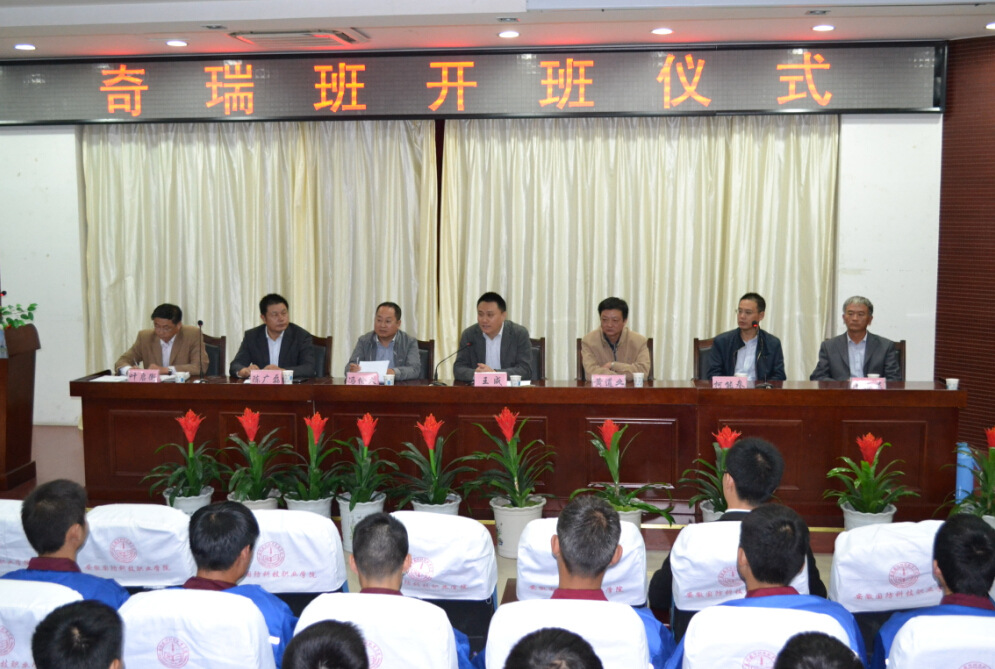 开班仪式上,汽车工程系副书记叶启衡对奇瑞公司和芜湖市经开区各位领导表示热烈欢迎,对有幸成为汽车系首届“奇瑞班”学员的同学表示祝贺。在讲话中,奇瑞公司人力资源部部长王成结合国内外的人才培养模式和人生职业规划等说明了校企合作的重要性。芜湖市经开区人力资源中心主任陈广磊介绍了芜湖经开区的发展历程、现状、取得的成就等,说明了人才的重要性,特别是高级技能人才。学院副院长冯伦久介绍了奇瑞公司的发展历程、奇瑞汽车对民族汽车工业的影响,进一步说明了校企合作的重要性与必然发展趋势,对“奇瑞班”的管理和教育提出了几点要求和希望。“奇瑞班”学生代表陈都同学,代表全体同学进行了发言,并做出了几点承诺,与大家进行共勉,争取在“奇瑞班”的平台上学有所获、学有所成!