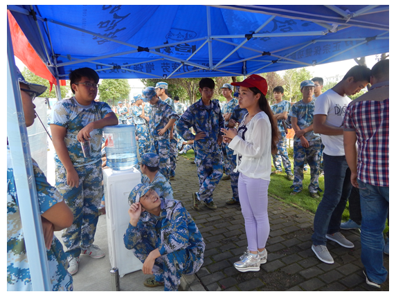 活动中,青年志愿者的学姐学长们不畏酷暑,为军训中的新生们送矿泉水。他们与新生交流聊天,积极地同学弟学妹们交流,为他们解答一些生活中的问题。策划部的一位学姐这样讲到:“过程虽不长但是很愉快,在送水的过程中接触到了许多的新生,同他们谈论了学院的概况,大学学习及玩乐的种种,解答了他们不少的疑惑。”