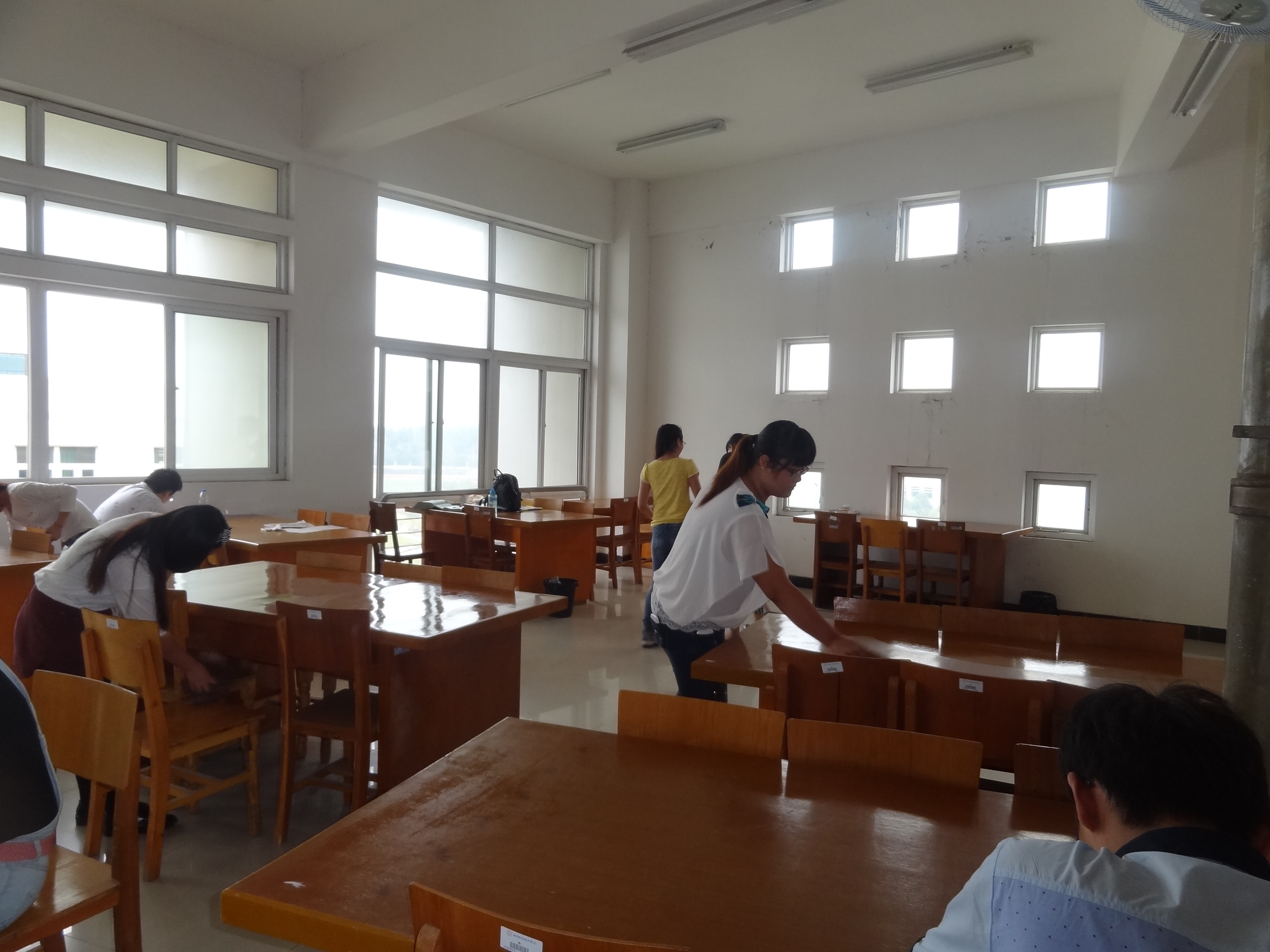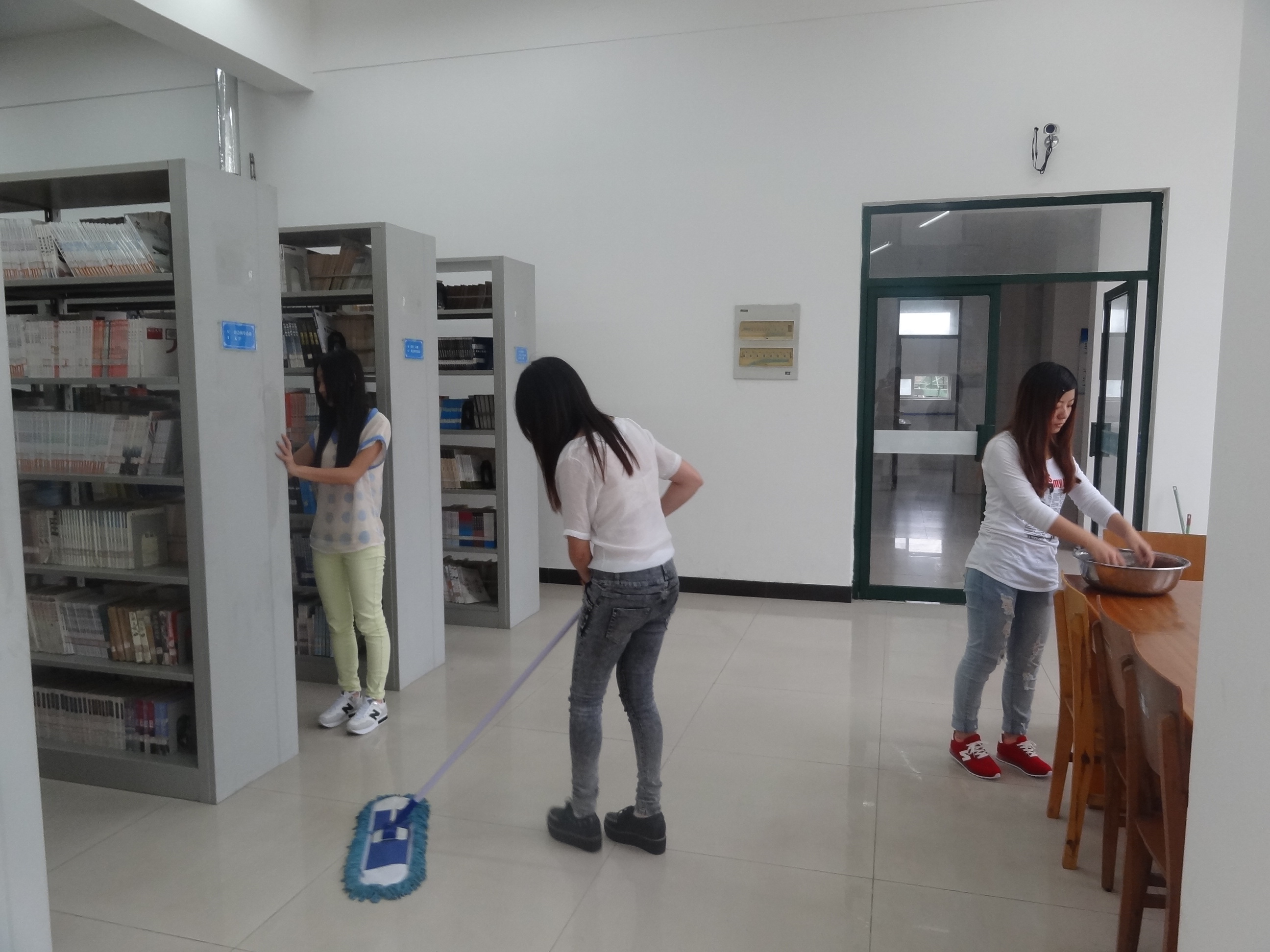 本次活动在尤朝莉老师的带领下,整理图书一万余册,倒架图书二万伍千余册。打扫了三个书库、自修室和阅览室的卫生,包括拖地、擦抹桌椅和门窗。活动历经三个多小时,整个场面热火朝天,同学们个个汗流浃背。