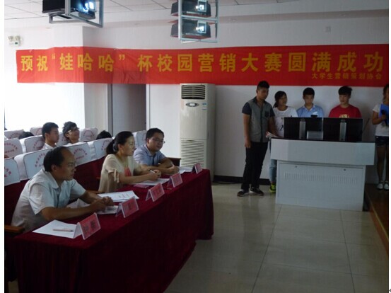 2014年6月13日19点,由管理工程系主办、大学生营销策划协会协办的院第五届营销策划大赛在图书馆导游实训室内举办。管理工程系李文君老师、韩银川老师、储成芳老师,协会指导老师杨学分老师,娃娃哈皖南扩展部钟衡应邀担任评委。