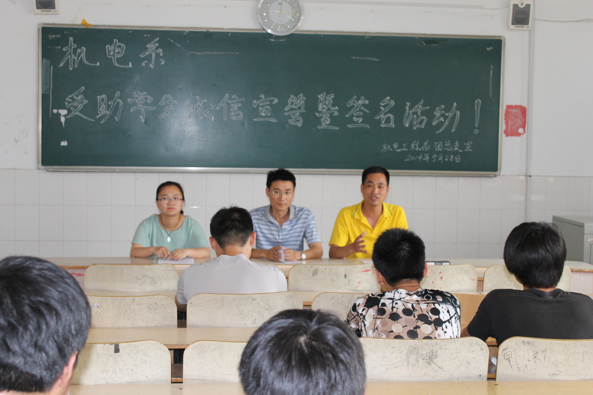 5月28日下午14:30,机电工程系在2号教学楼107教室举行了“机电工程系受助学生诚信宣誓暨签名活动”。活动由机电工程系团总支书记张红军老师主持。