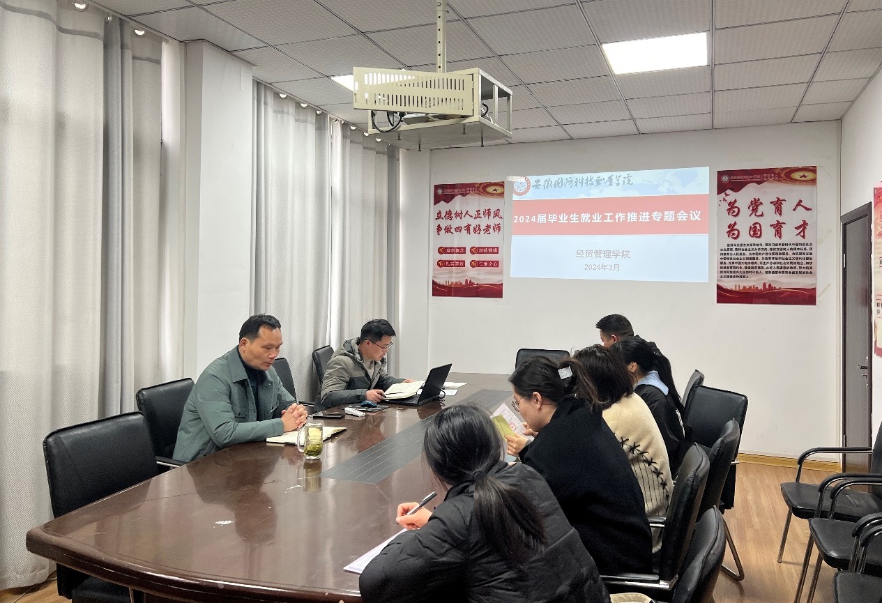 本网讯(经贸管理学院 陈龙)为贯彻落实2024届全省普通高校毕业生就业工作培训暨调度视频会议精神,进一步做好毕业生服务工作,促进毕业生就业工作走深走实,经贸管理学院于3月13日在知行楼204会议室召开2024届毕业生就业工作专题推进会。会议由学院党总支书记刘峰主持,各毕业班辅导员、就业辅导员参会。