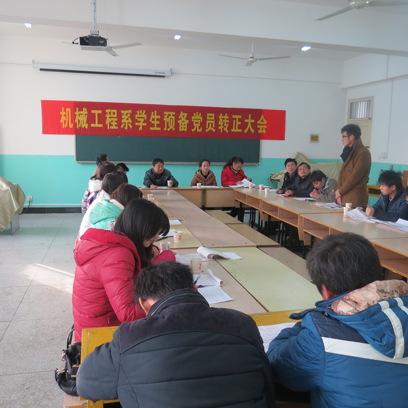 2013年12月26日下午,机械工程系第一党支部、第二党支部分别召开支部大会,讨论潘月亮等38名预备党员的转正问题。会议由各支部书记主持,支部全体党员及申请转正的预备党员参加了会议。