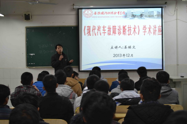12月8日下午三点半,在2号教学楼210教室,汽车检测与维修技术专业负责人姜继文高级技师做了题为“现代汽车故障诊断技术 ”的学术报告。本次讲座由汽车工程系团总支书记余桂刚老师主持,学院汽车专业部分教师、学生和汽车爱好者参加了此次讲座。
