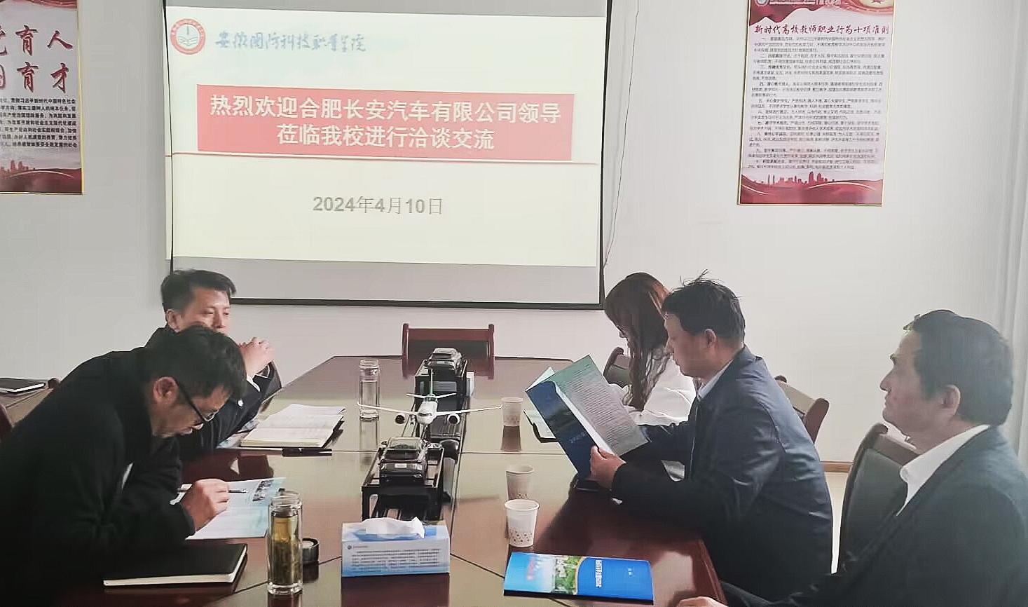 本网讯(汽车技术学院 黄世超)为了进一步推动产教融合工作的协同创新,开创校企合作共赢、共谋发展的良好局面,4月10日上午,合肥长安人力资源处袁维民处长一行来校洽谈合作,汽车技术学院副院长(主持工作)姜继文、汽车技术学院党总支副书记余桂刚,就业辅导员黄世超参加座谈会。