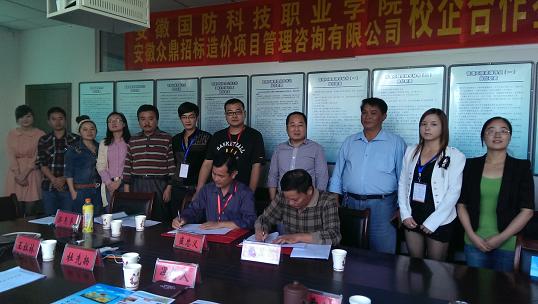 10月9日下午,建筑工程系与安徽众鼎招标造价项目管理咨询有限公司校企合作签约仪式在行政楼二楼建筑工程系会议室举行。会议由系主任助理王红林主持。参加签字仪式的企业方代表有安徽众鼎招标造价项目管理咨询有限公司总经理崔忠义、副总经理梁亮亮、人力资源部主任黄映华等一行8人。学院副院长冯伦久、校企合作办公室主任王希江、系主任张显国、系书记杜先扬及系专业教师参加了签约仪式。