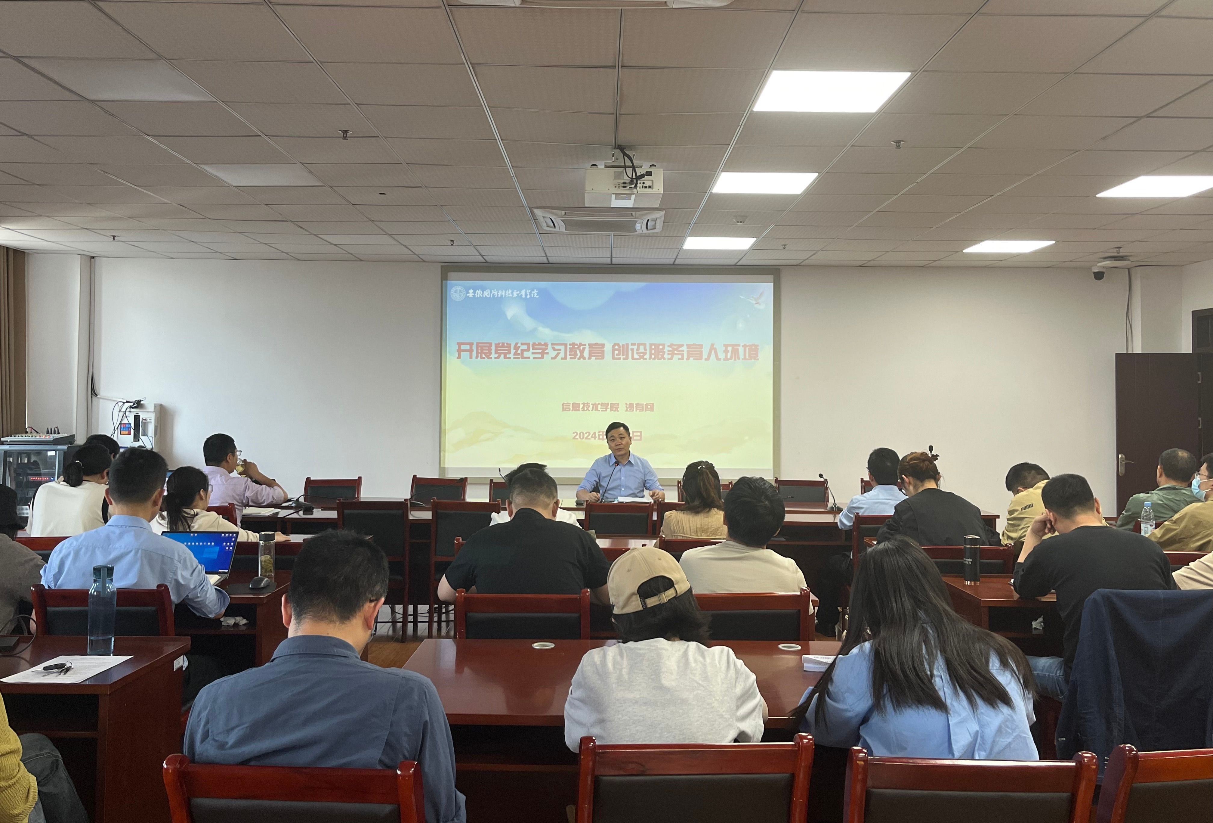 本网讯(信息技术学院 杜洪宇)为进一步增强学院全体党员纪律意识,真正做到受警醒、存戒惧、明底线,结合党纪学习教育工作部署,5月8日下午,学校党委委员、信息技术学院院长沙有闯同志为全体师生党员讲授了题为《抓好党纪学习教育,营造风清气正育人环境》的专题党课。