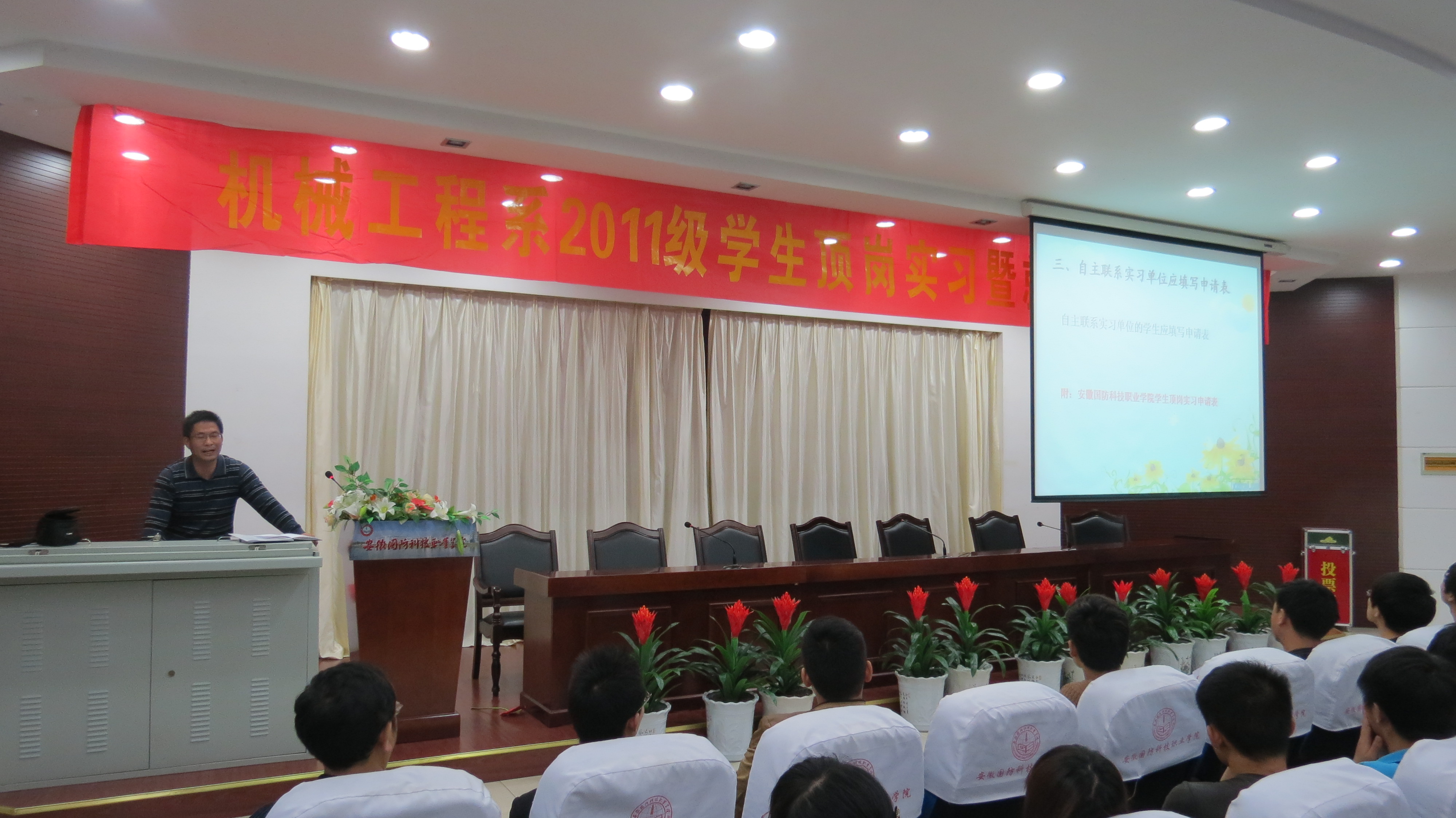 5月8日晚,机械工程系2011级学生顶岗实习暨就业动员大会在图书馆报告厅顺利举行。系党总支书记束传俊、副书记孙武、主任黄道业、副主任朱修传及辅导员杨静、孙策等老师出席会议,会议由孙武主持。