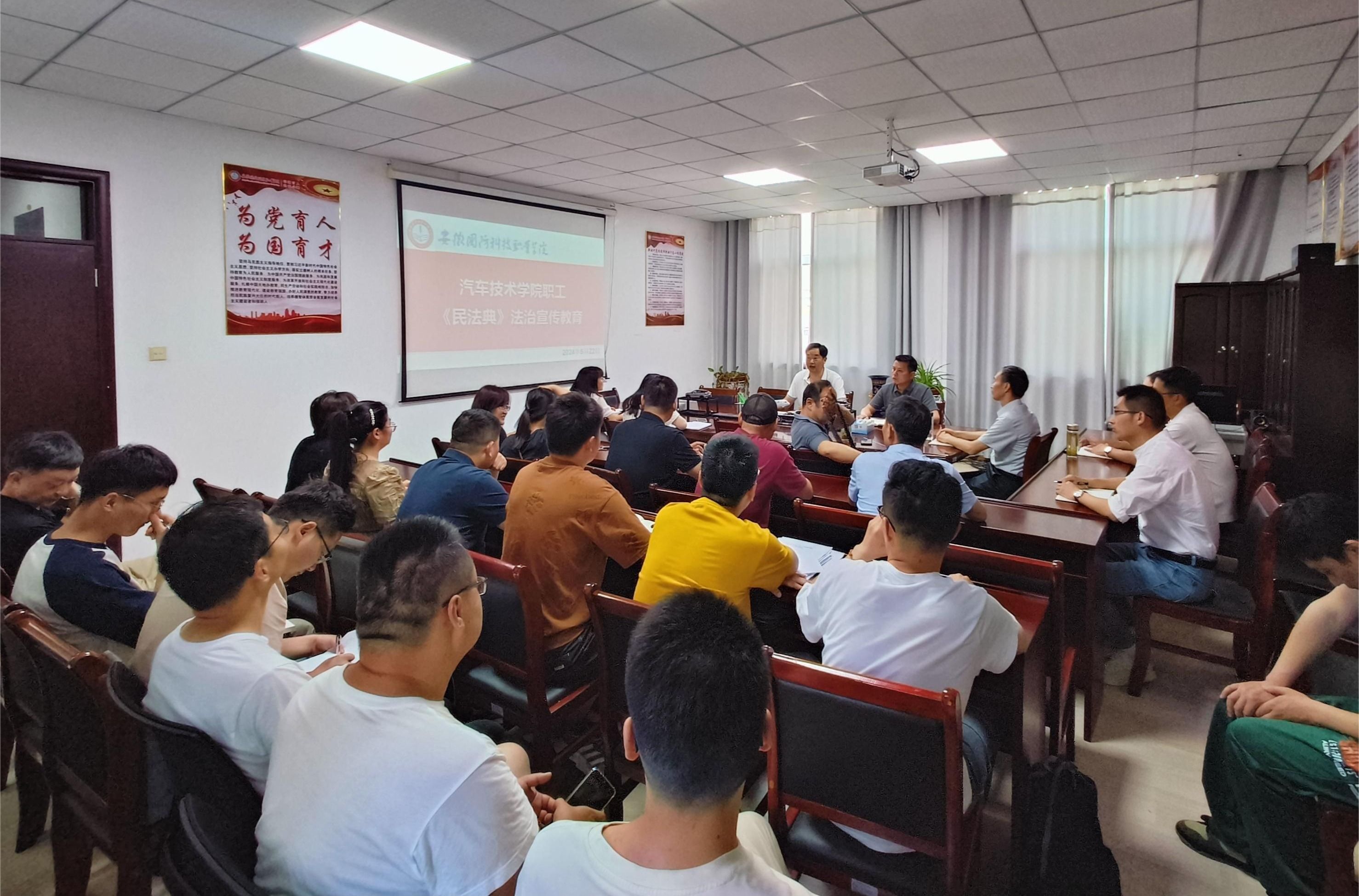 本网讯(汽车技术学院 任培培)为全面贯彻落实党的二十大精神和深入学习贯彻习近平法治思想,积极推动民法典学习宣传往深里走、往实里走、往心里走,5月22日下午,汽车技术学院召开全体职工会议,学习讨论民法典部分内容及上级文件精神,并就近期重点工作作出部署。会议由副院长(主持工作)姜继文主持。