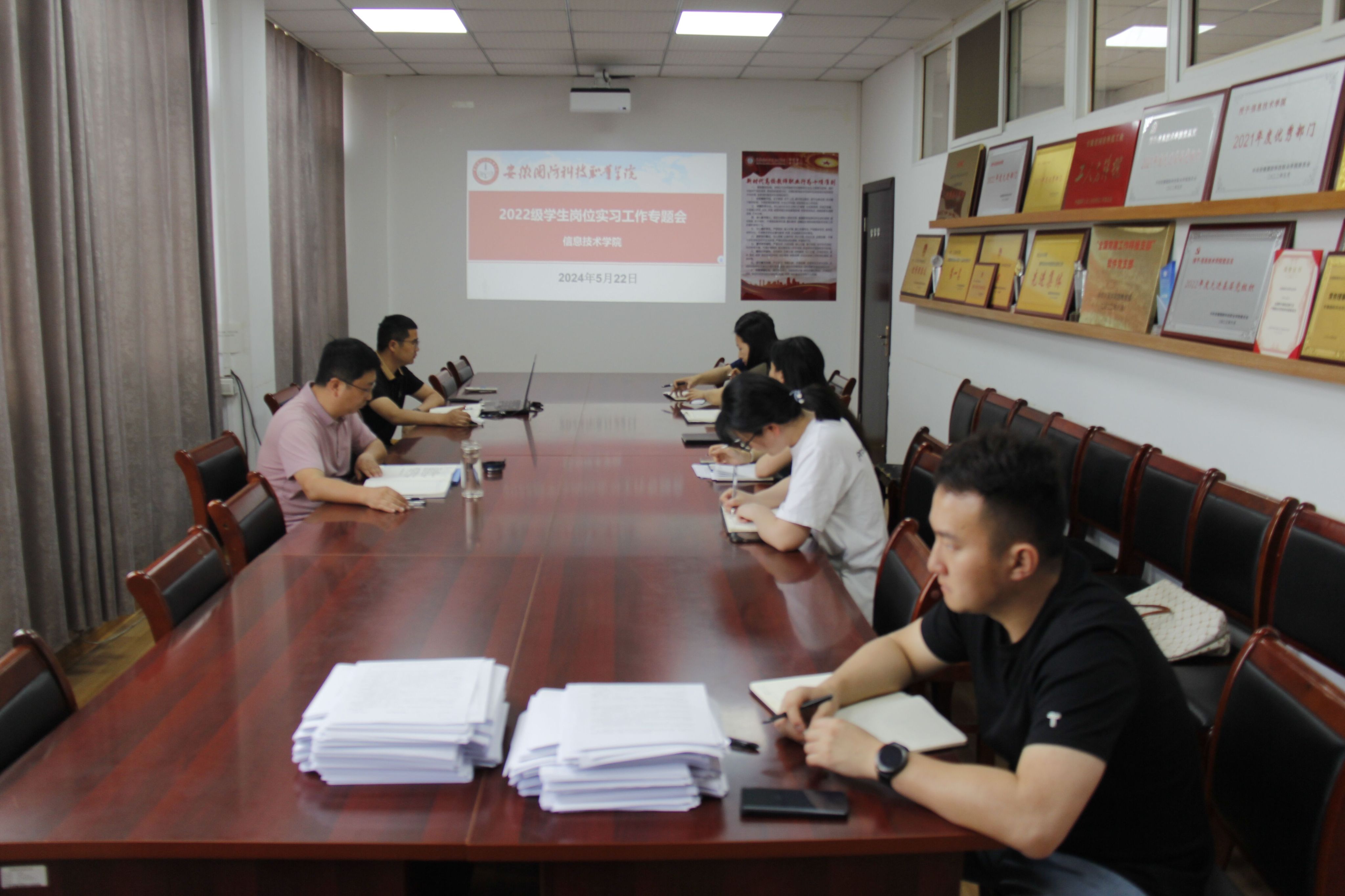 本网讯(信息技术学院 严晓曼)5月22日,信息技术学院在知行楼304召开2022级学生岗位实习工作专题会。学院党总支书记王胜、党总支副书记杜洪宇,以及2022级全体辅导员参与会议。
