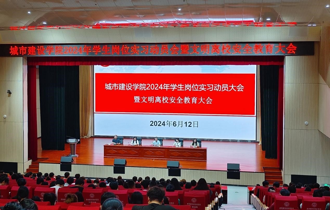 本网讯(城市建设学院 袁小永)为做好2024年学生岗位实习工作,6月12日晚,城市建设学院在学校产教融合中心报告大厅召开了2024年岗位实习动员大会暨期末安全教育和文明离校大会,城市建设学院党总支书记张宗江、院长王红林、副书记叶高洁、副院长左飞、组织员胡仕婷、学院辅导员、岗位实习指导教师及全体2025届毕业生参加会议,会议由左飞主持。
