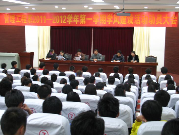 10月26日晚,管理工程系在图书馆报告厅隆重召开2011——2012学年第一学期学风建设动员大会,系党总支书记杜先扬、系团总支书记杨力、各年级辅导员和各班学生干部及学生代表参加了大会。会议由杨力主持。