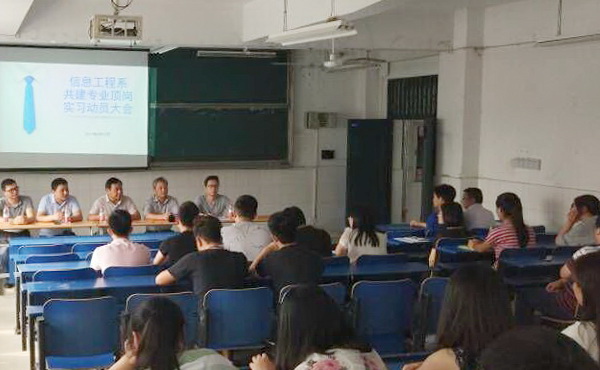 近日,在学院二号教学楼阶梯教室,学院党委委员、信息工程系系主任黄存东主持召开了2015级校企共建班学生顶岗实习动员会,信息工程系党总支书记梁继会、科大讯飞企业学习顾问卢晓明、高级工程师张家勇、慧众聚成互联网学院主任陈昀以及相关班级的班主任、实习指导老师和90余名学生参加了此次会议。