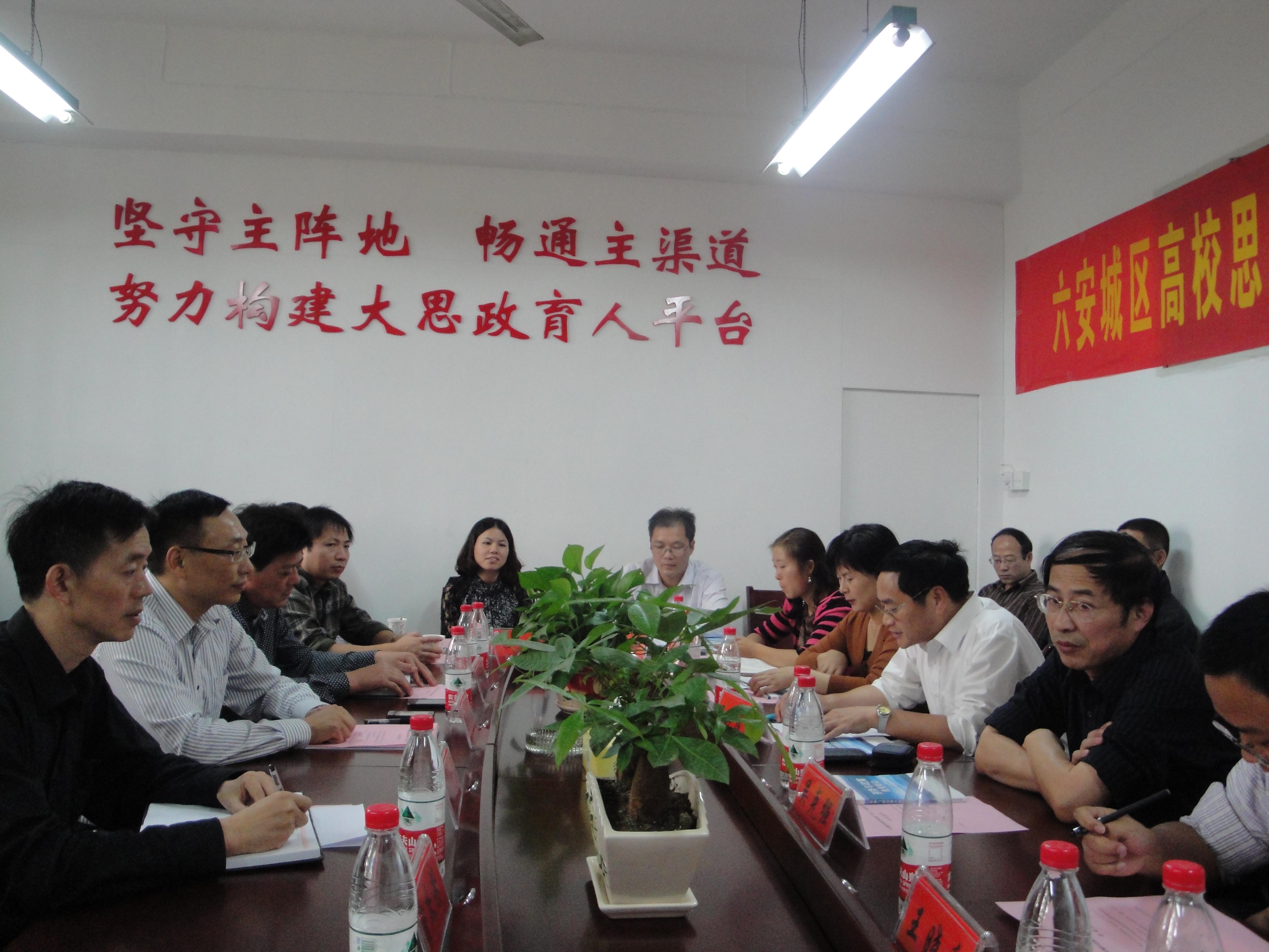10月10日下午,六安城区高校思政理论课“手拉手”共建研讨会在皖西学院思政部举行。皖西学院思政部主任郝先中、党总支书记曹大宏,六安职业技术学院思政部主任吴克强,皖西卫生职业技术学院基础学部主任翟红慧以及我院思政部主任吴方庭、思政教研室主任张广舟、形势与政策教研室主任李倩以及教学秘书聂勇等参加了此次研讨会。会议由皖西学院思政部主任郝先中主持并致欢迎词。