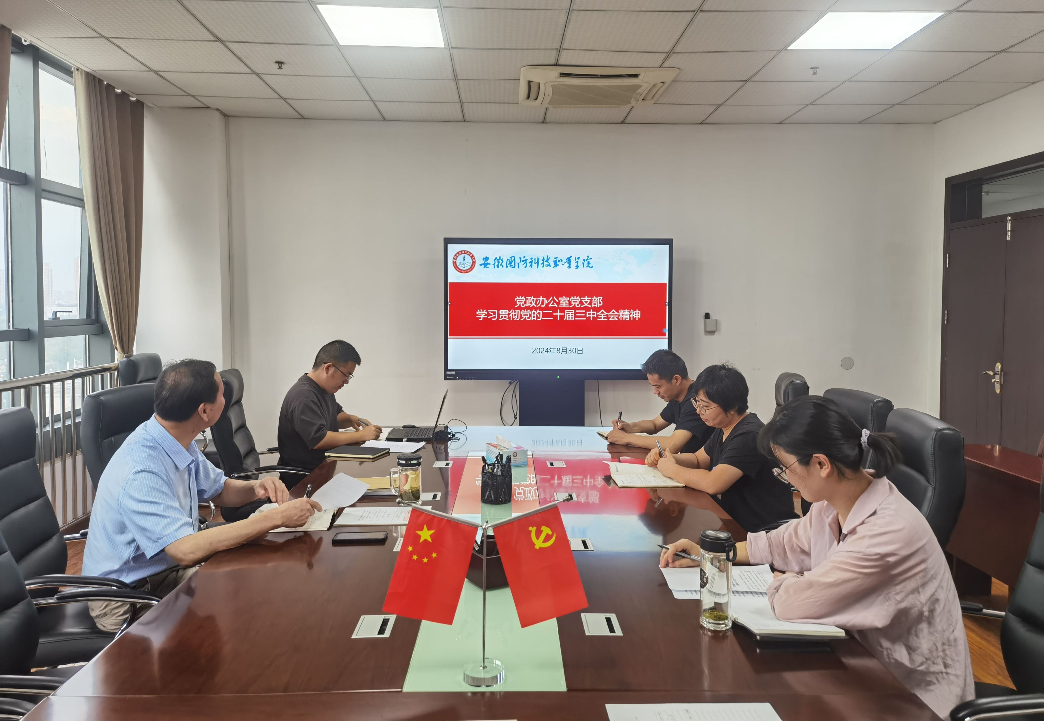 本网讯(党政办 鲍荣君)8月30日,党政办公室党支部在党委会议室开展主题党日活动,深入学习贯彻党的二十届三中全会精神。会议由党支部书记李大武主持,全体党员参加学习。