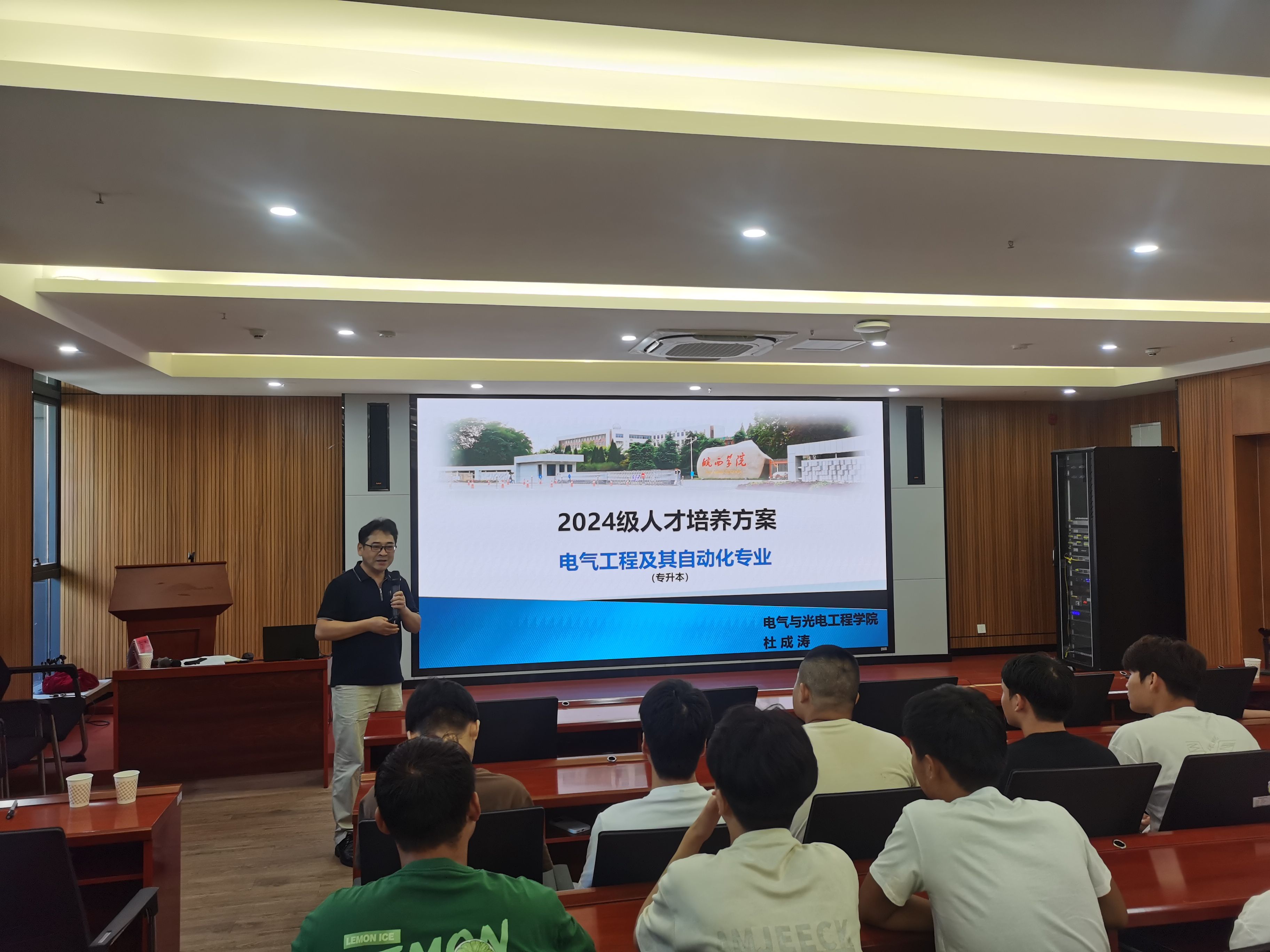 杜成涛对2024级专升本电气工程及其自动化专业人才培养方案进行了解读,他从人才培养方案制定的基本原则、目标与定位、培养方案内容等方面重点进行了讲解。通过专业介绍,同学们对所学专业有了更深入的认识和了解,对自己未来专业课程学习和职业生涯规划也有了全面、全新的展望。至此,2024级专升本联合培养电气工程及其自动化专业开学典礼暨入学教育大会圆满结束。