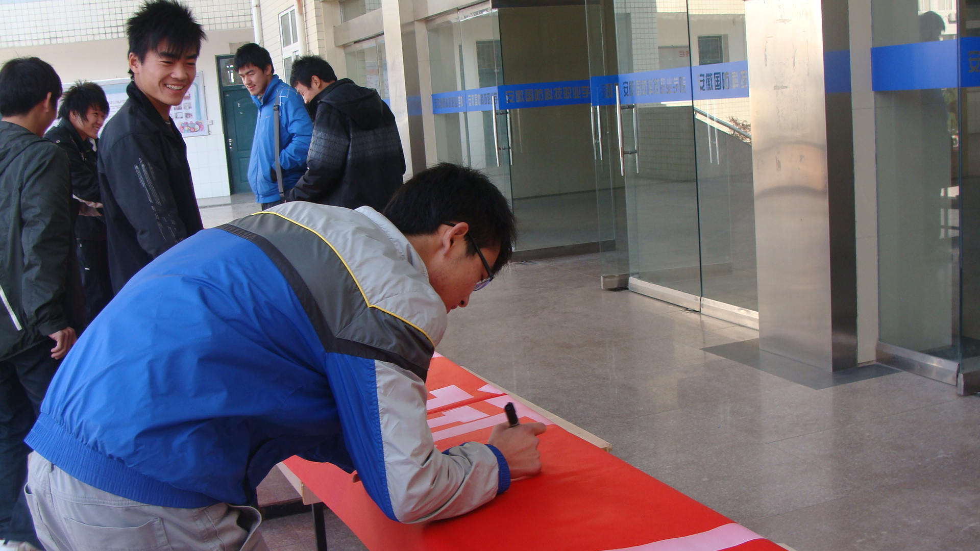 为了提高学生的诚信意识,端正考风考纪,创造良好的考试秩序,2010年12月22日中午,机械工程系在2栋教学楼门前举办了以“文明考风、诚信考试、从我做起”为主题的诚信签名活动。