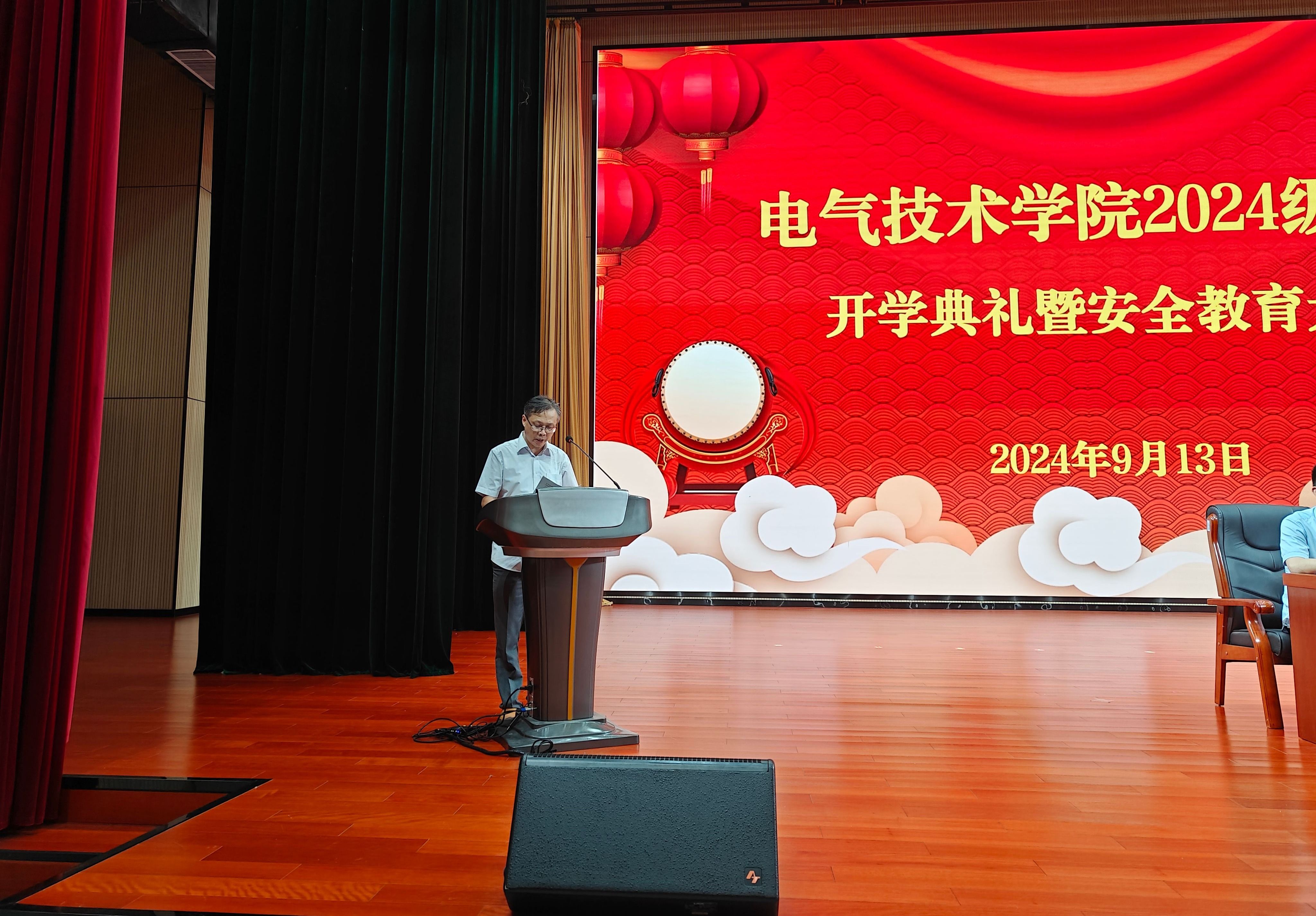 本网讯(电气技术学院 江治国)9月13日,电气技术学院在产教融合中心报告厅隆重举行了2024级新生开学典礼暨安全教育大会。学院党政领导、各专业教师以及全体2024级新生齐聚一堂,共同开启这一意义非凡的新征程,开学典礼在庄严的国歌声中拉开序幕。