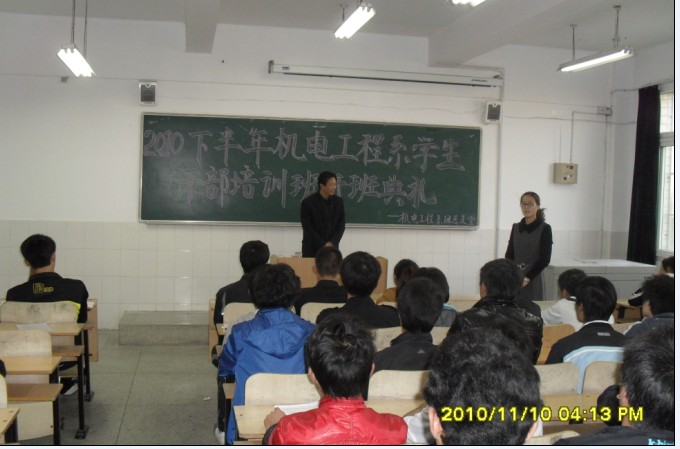 为加强学生干部队伍建设,提高学生干部的综合素质和工作能力,促进广大团学干部的自我学习和自我教育的主动意识,2010年11月中旬,机电工程系系团总支在2#107组织召开了2010下半年学生干部培训班的开班典礼和讲座。院工会副主席芮长春、系团总支书记刘严及系所有学生会干部和班级主要干部出席了本次大会。