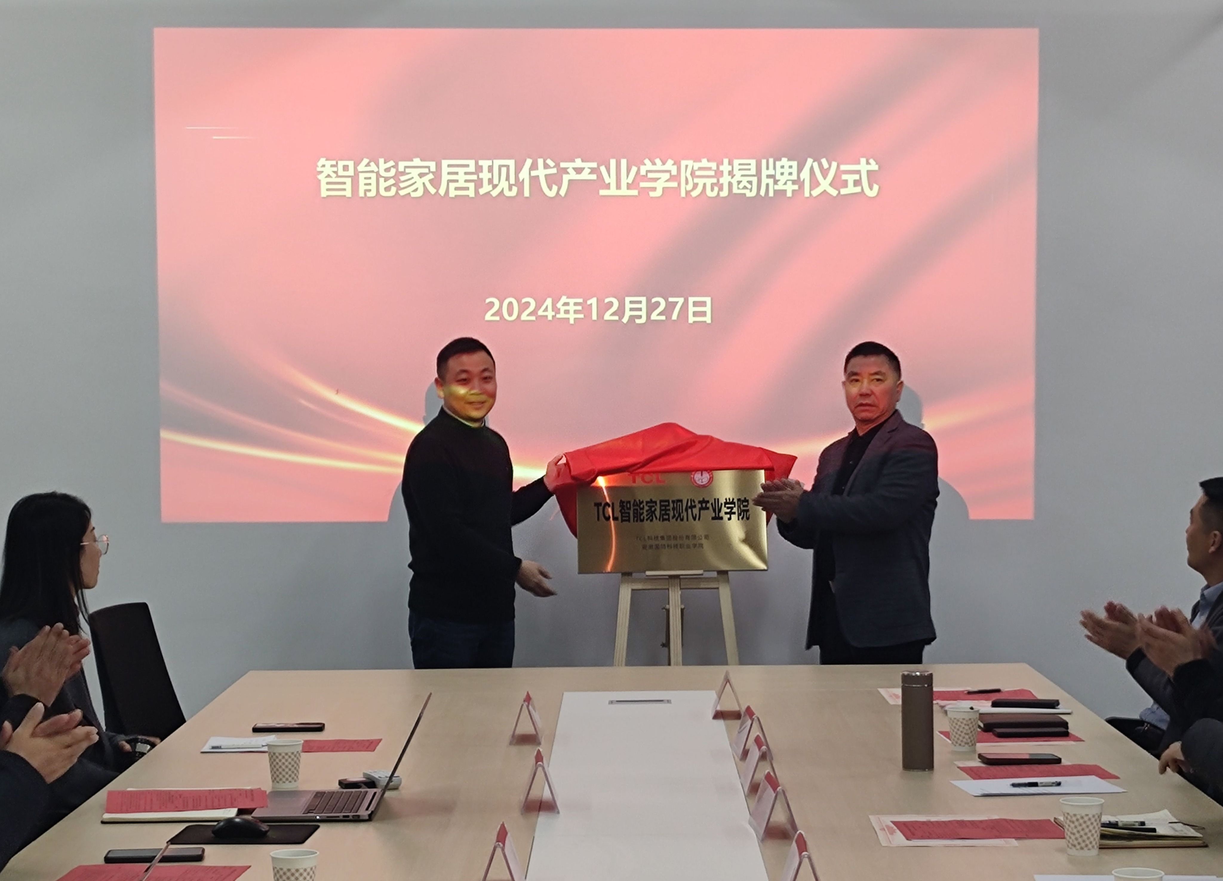 本网讯(电气技术学院 卢明瑞)为进一步深化校企合作、产教融合,推进智能家居产业学院建设工作,12月27日,电气技术学院邀请产业学院合作共建企业来校开展了智能家居现代产业学院校企合作签约暨产业学院揭牌仪式。学校党委委员、信息技术学院院长沙有闯,校企合作办主任李中永,电气技术学院党政领导班子、专业带头人以及TCL科技集团有限公司、中国联合网络通信有限公司六安市分公司等10家合作共建企业代表参加了本次会议。