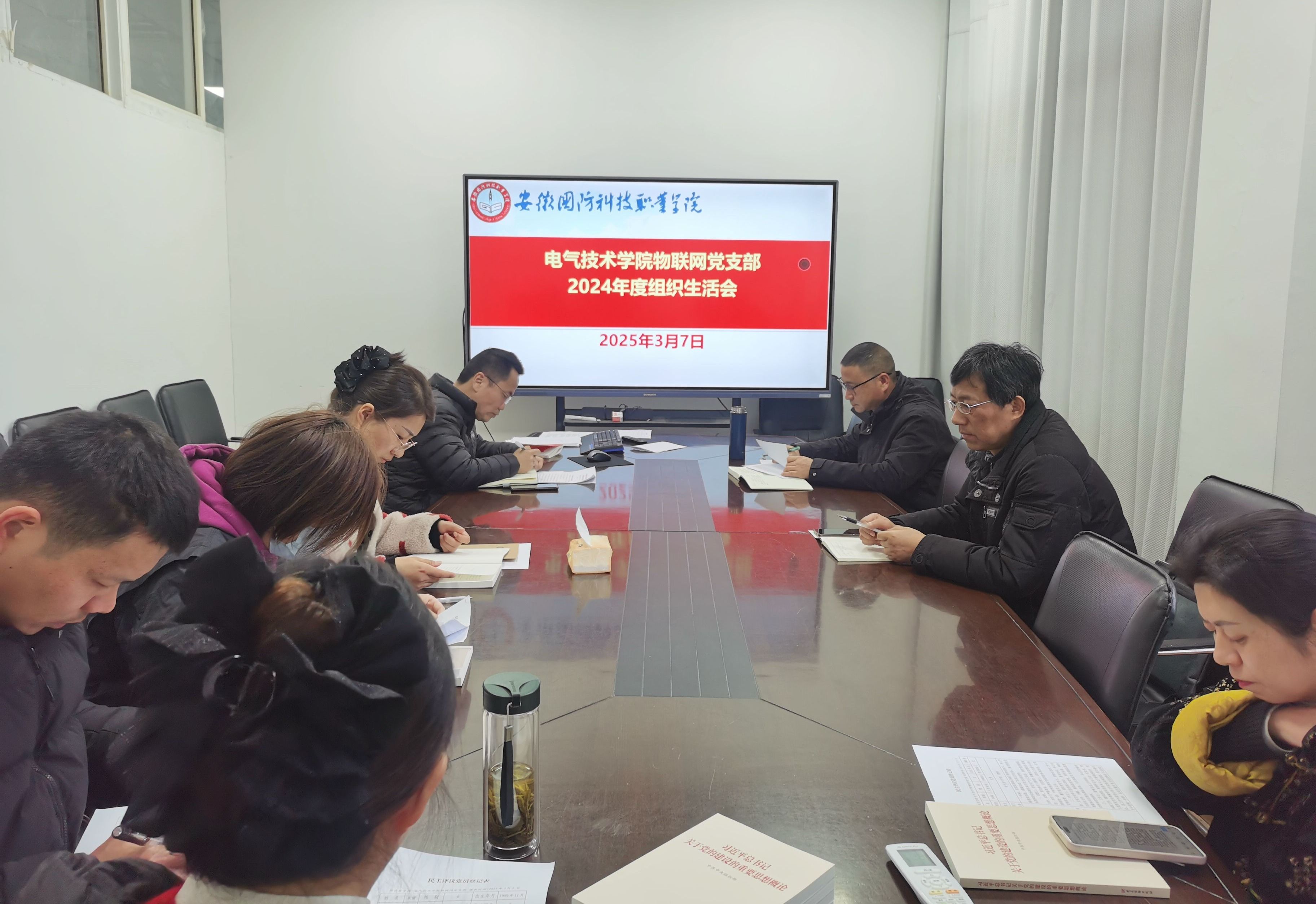 本网讯(电气技术学院 史媛芳)为深入学习贯彻习近平新时代中国特色社会主义思想和党的二十届三中全会精神,巩固深化党纪学习教育成果,3月7日下午,电气技术学院物联网党支部在知行楼102会议室召开了2024年度组织生活会,并开展了民主评议党员工作。校党委委员、副校长袁旗出席会议并点评,支部全体党员参加会议,会议由党支部书记江治国主持。
