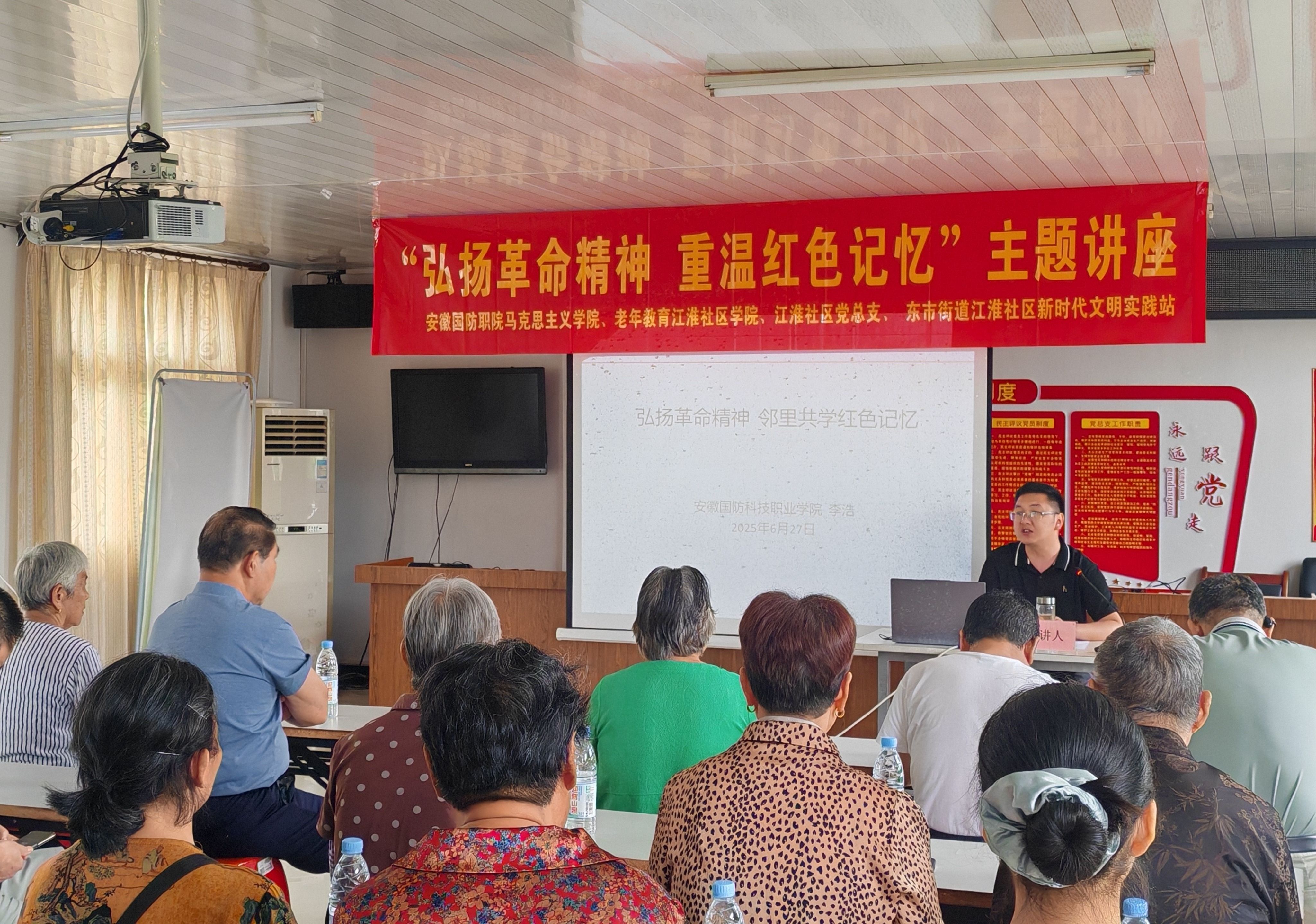 本网讯 为深入学习贯彻习近平总书记考察安徽重要讲话精神,推动红色文化深入基层,马克思主义学院联合继续教育学院在江淮社区开展了“弘扬革命精神 重温红色记忆”主题宣讲活动。6月27日下午,马克思主义学院教师李浩走进江淮社区,宣讲红色文化课,让党的光荣传统和革命精神在基层落地生根。