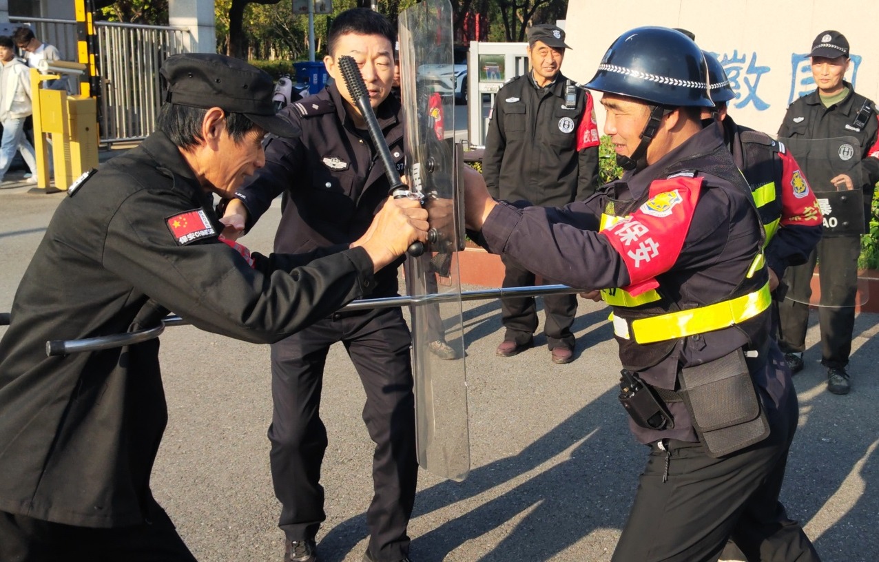 理论培训阶段,七里站派出所所长曹燕警官结合校园安全实际,开展反恐防暴理论授课,系统讲解暴恐事件的识别要点、应急处置流程及自我保护技巧,着重强调“预防为先、快速响应、协同作战”的处置原则。在器械实操环节,曹燕所长现场示范防暴盾牌的格挡技巧、钢叉的约束动作及长棍的防御要领,针对 “反冲撞”“防砍杀” 等实战场景,逐一纠正参训人员的动作偏差,确保每位安保人员熟练掌握器械使用规范。