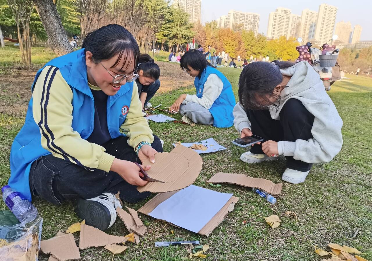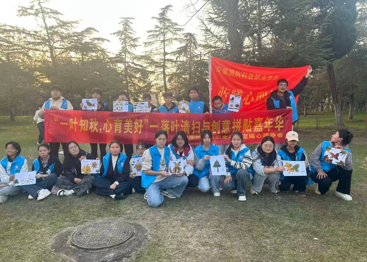 创作环节中,同学们围坐在一起,将收集到的自然素材进行巧思拼贴。普普通通的落叶在同学们的巧手下被赋予了全新的生命,变成了一幅幅充满想象力与个人情感的艺术作品。活动现场气氛轻松愉悦,欢声笑语不断,大家在动手协作与精心创作中,有效释放了压力,感受到了内心的平静与满足。