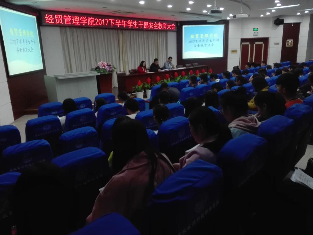 为贯彻落实全省高校安全稳定工作培训班工作部署及学校安全稳定工作会议精神,经贸管理学院于10月16日晚在图书馆报告厅召开2017下半年学生干部安全教育大会,院党总支书记杜先扬、党总支副书记刘峰出席会议,全体学生干部参加了此次大会,会议由团总支书记付玉梅主持。