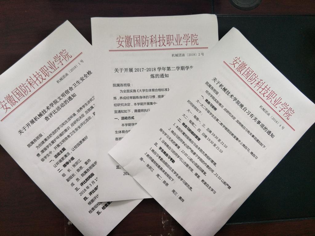 建章立制,狠抓制度建设。机械技术学院下发了《关于开展机械技术学院文明宿舍卫生安全检查评比活动的通知》(机械团函【2018】2号)、《关于开展2017-2018学年第二学期学生早锻炼的通知》(机械团函【2018】4号)和《关于机械技术学院晚自习有关事项的通知》,3月16日在学生干部大会上宣传部署,3月20日和21日在16和17级晚自习时间,陈思副书记深入到院属各班级全面动员,确保文件精神传达到每一位学生。