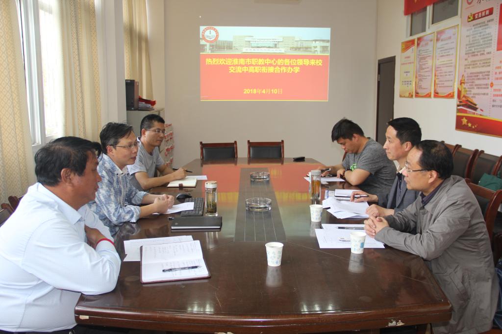 本网讯(电气技术学院 程坤)4月10日,淮南市职业教育中心教学主任齐主任一行3人来到电气技术学院,针对中高职衔接相关事宜与电气技术学院进行了深入的交流和探讨。会议在行政楼106会议室进行,由电气技术学院院长李翔主持,党总支书记王希江、副院长侯国栋参加了本次会议。