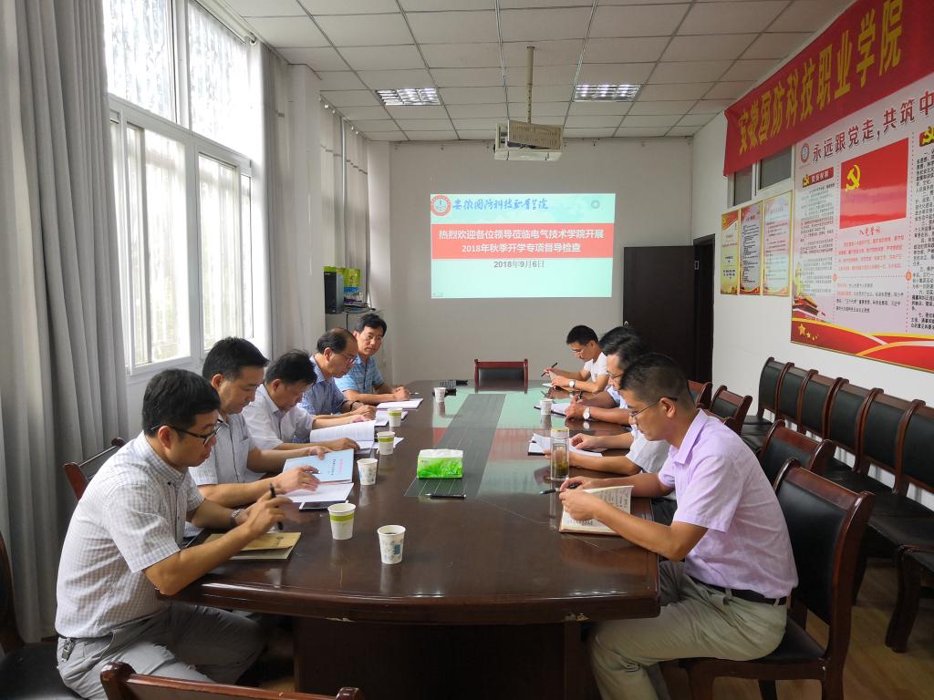 本网讯(电气技术学院 史媛芳)9月6日下午,校长李麟书、副校长丁守宝、宣传部长袁旗、党政办主任李存鹏、教务处长王志宏、学生处长孙良平一行亲临电气技术学院进行秋季开学专项督导检查工作,学院院长李翔、党总支书记王希江等领导参加了督查会并汇报相关工作。