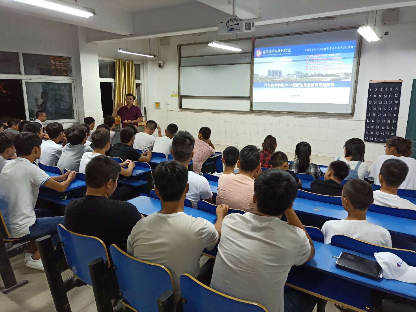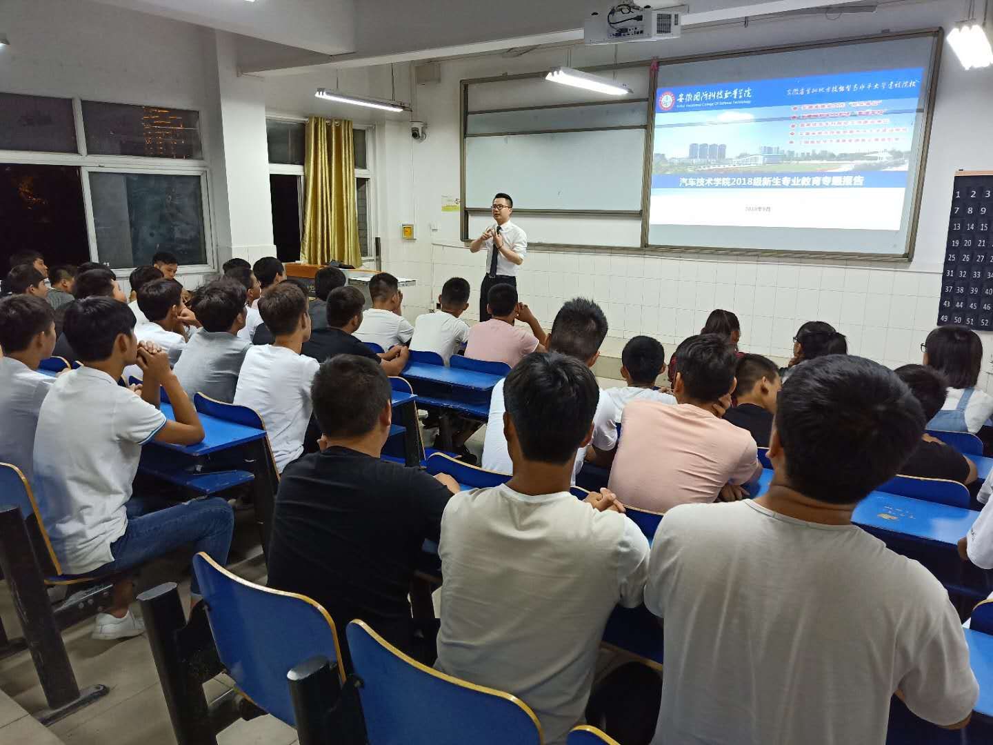 专业介绍时,汽车技术学院副院长姜继文给2018级新生们深入讲解了汽车类专业的社会需求及发展前景,并分别就汽车检测与维修、汽车制造与装配、汽车营销与服务、汽车电子等专业的培养目标、知识能力体系、课程设置、学分要求、实训实践环节的开展以及未来实习就业等做了详细解说,给新生们提出了许多宝贵的建议。并鼓励同学们把握学习机会,珍惜实践机会。同学们仔细倾听并表现出对专业学习极大的兴趣和认真的求知态度。